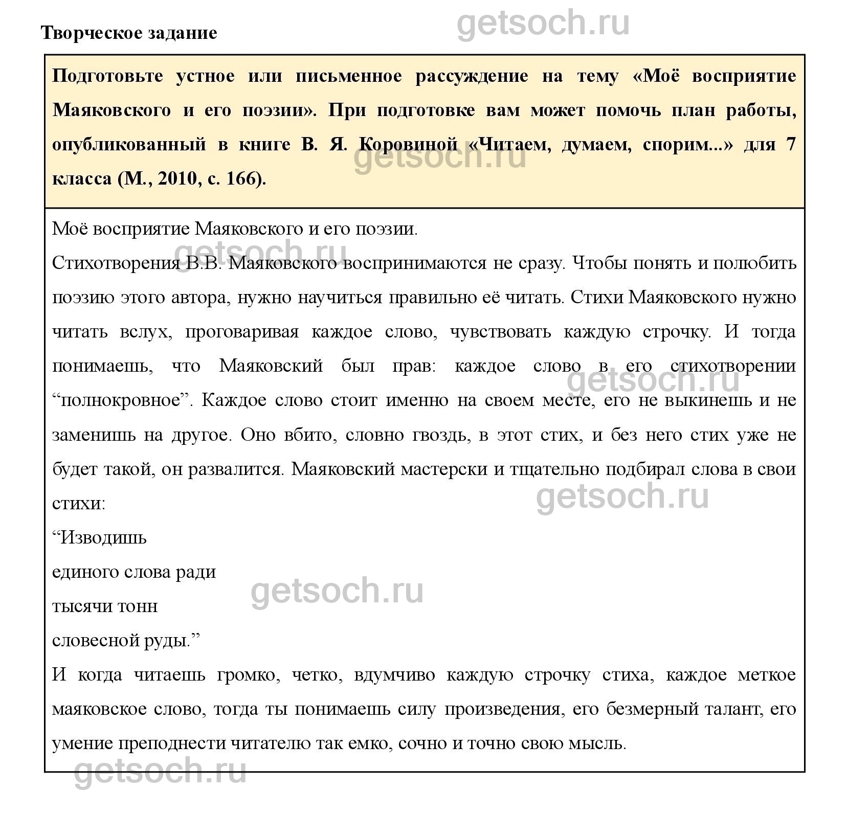 Подготовьте устное или письменное рассуждение на тему «Моё восприятие Маяковского и его поэзии». При подготовке вам может помочь план работы, опубликованный в книге В. Я. Коровиной «Читаем, думаем, спорим…» для 7 класса (М., 2010, с. 166).