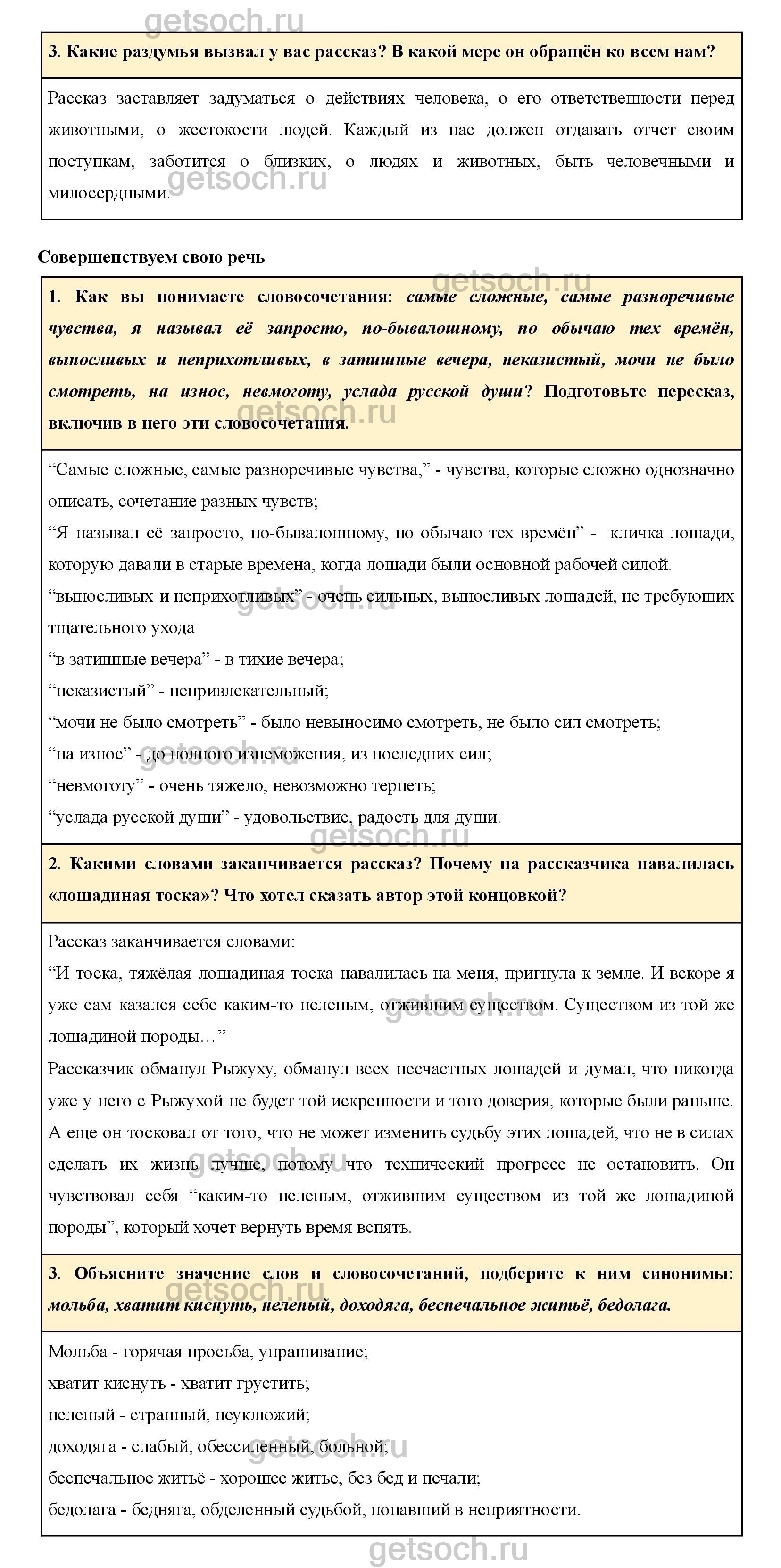 1. Как вы понимаете словосочетания: самые сложные, самые разноречивые чувства, я называл её запросто, по-бывалошному, по обычаю тех времён, выносливых и неприхотливых, в затишные вечера, неказистый, мочи не было смотреть, на износ, невмоготу, услада русской души? Подготовьте пересказ, включив в него эти словосочетания.