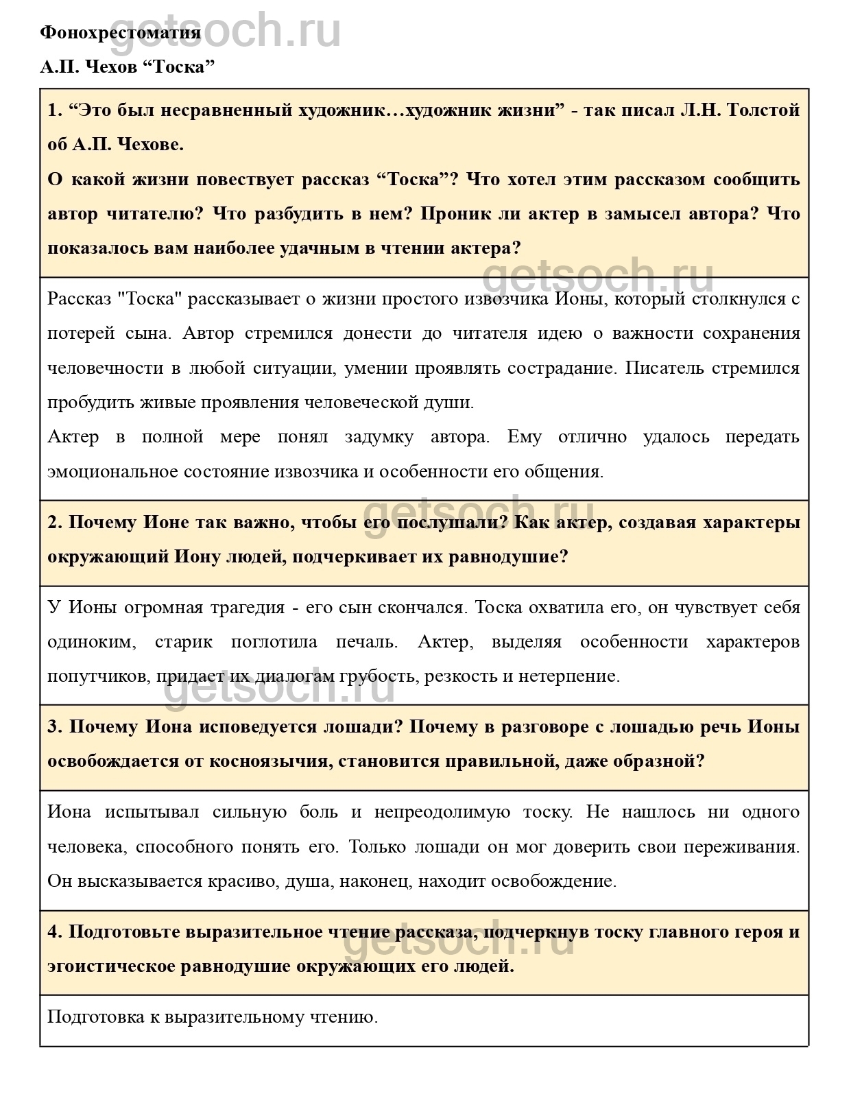 О какой жизни повествует рассказ “Тоска”? Что хотел этим рассказом сообщить автор читателю? Что разбудить в нем? Проник ли актер в замысел автора? Что показалось вам наиболее удачным в чтении актера?2. Почему Ионе так важно, чтобы его послушали? Как актер, создавая характеры окружающий Иону людей, подчеркивает их равнодушие?