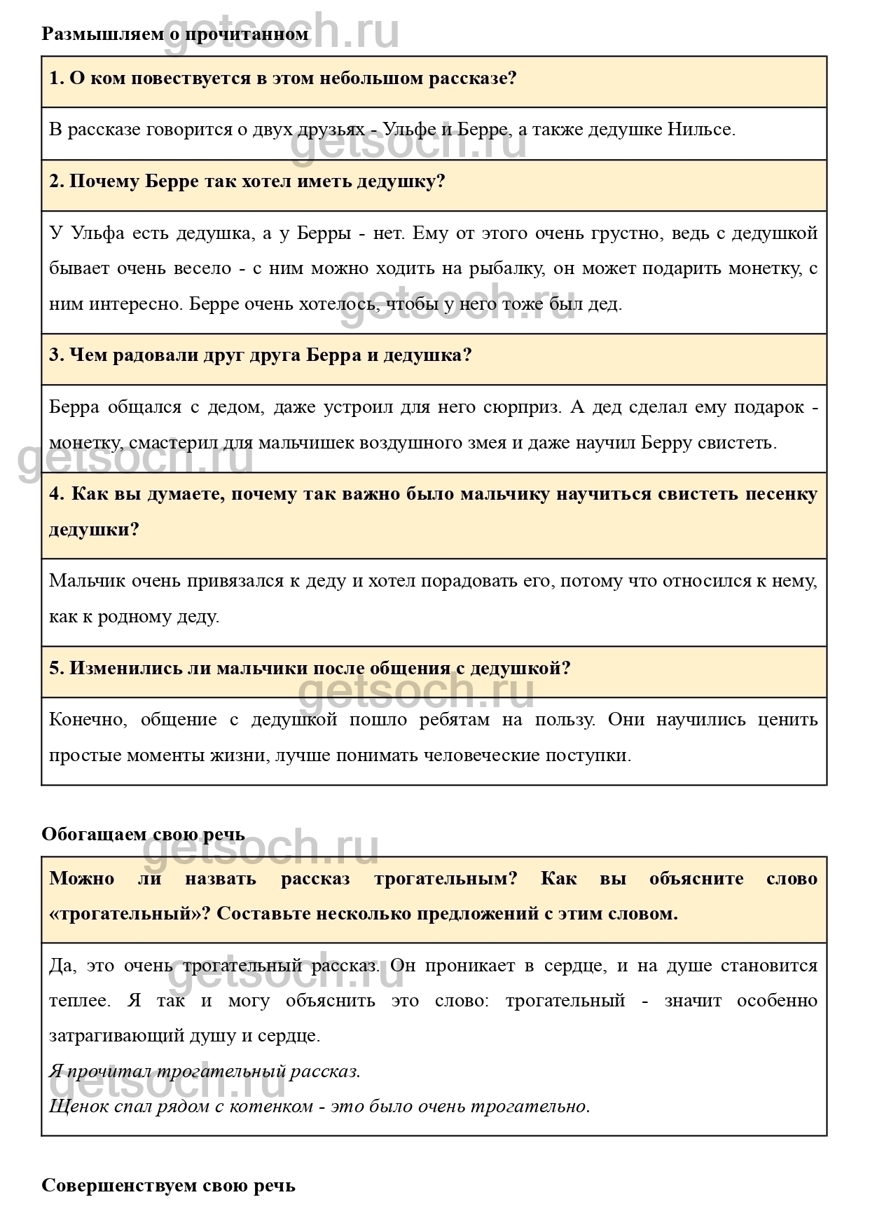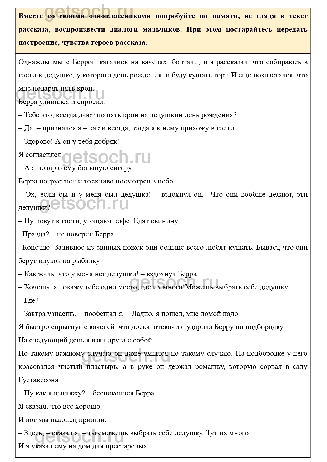 Вместе со своими одноклассниками попробуйте по памяти, не глядя в текст рассказа, воспроизвести диалоги мальчиков. При этом постарайтесь передать настроение, чувства героев рассказа.