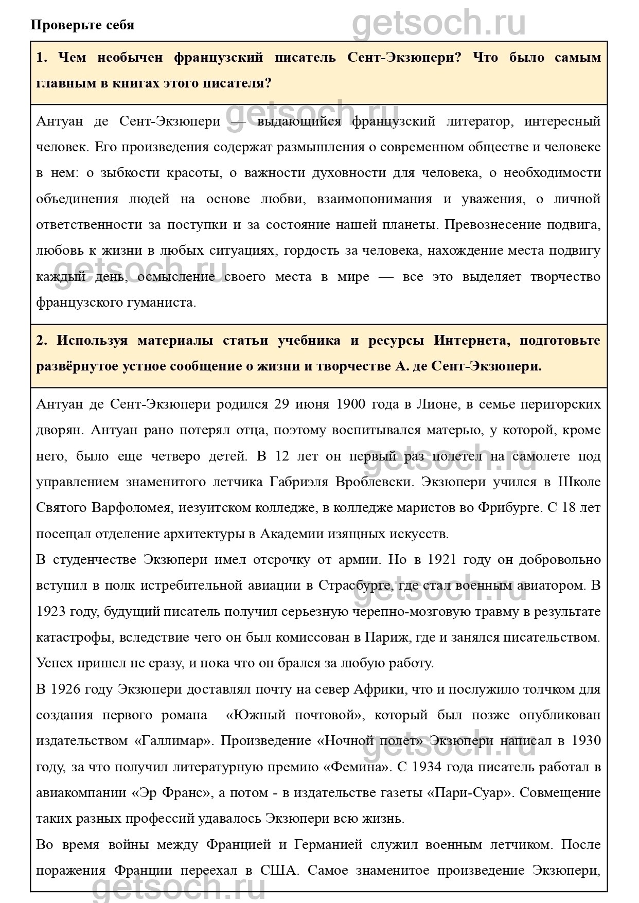 2. Используя материалы статьи учебника и ресурсы Интернета, подготовьте развёрнутое устное сообщение о жизни и творчестве А. де Сент-Экзюпери.