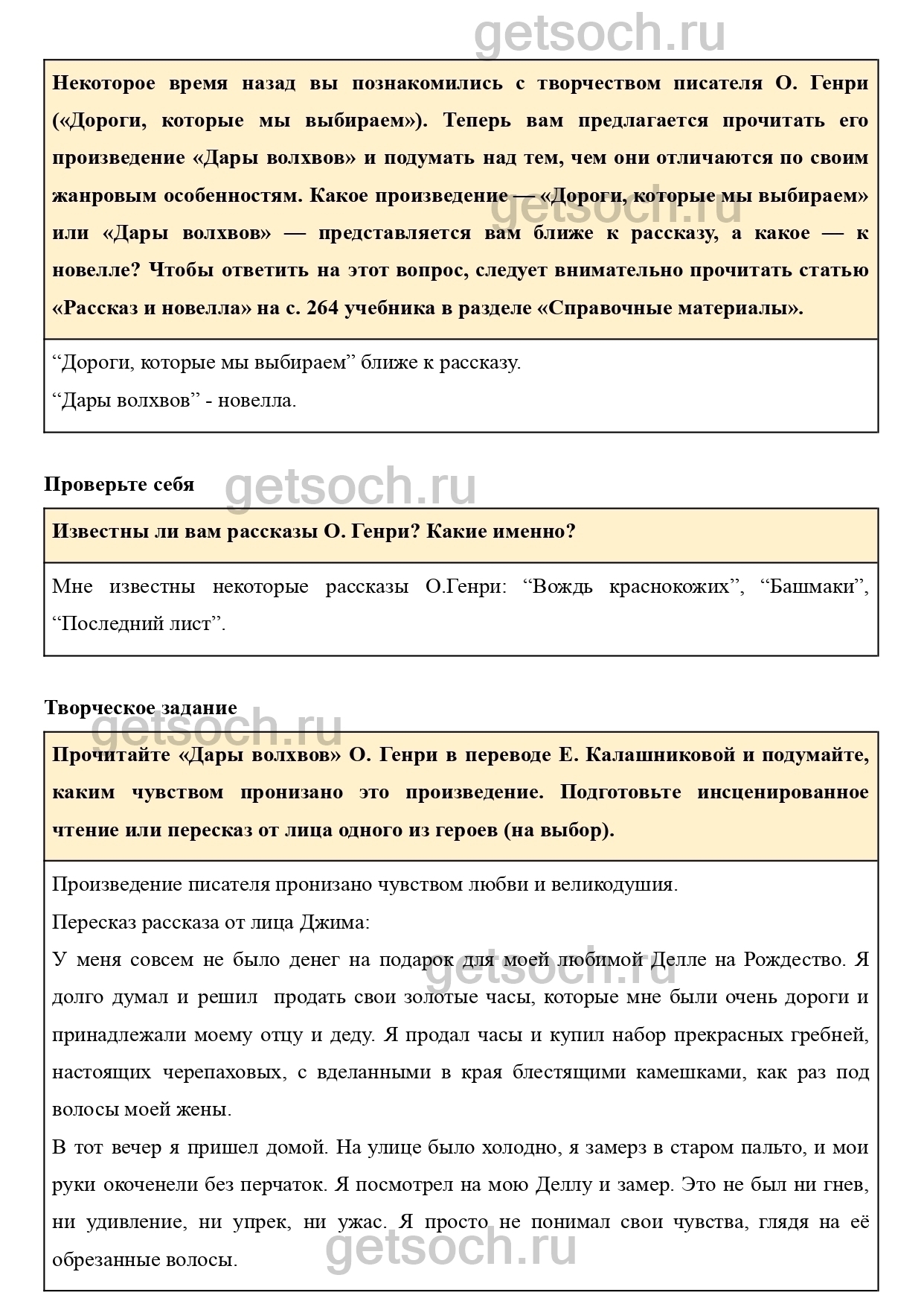 Некоторое время назад вы познакомились с творчеством писателя О. Генри («Дороги, которые мы выбираем»). Теперь вам предлагается прочитать его произведение «Дары волхвов» и подумать над тем, чем они отличаются по своим жанровым особенностям. Какое произведение — «Дороги, которые мы выбираем» или «Дары волхвов» — представляется вам ближе к рассказу, а какое — к новелле? Чтобы ответить на этот вопрос, следует внимательно прочитать статью «Рассказ и новелла» на с. 264 учебника в разделе «Справочные материалы».
