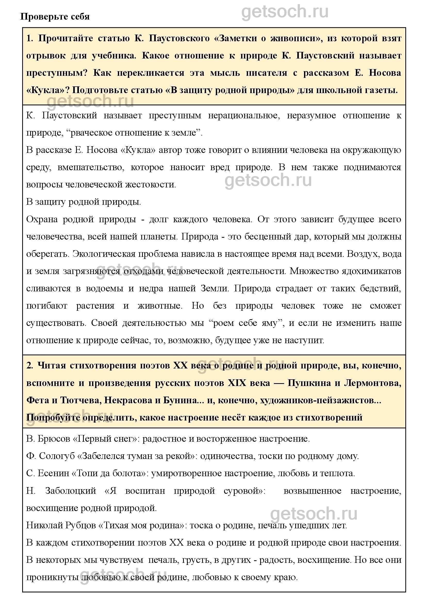 1. Прочитайте статью К. Паустовского «Заметки о живописи», из которой взят отрывок для учебника. Какое отношение к природе К. Паустовский называет преступным? Как перекликается эта мысль писателя с рассказом Е. Носова «Кукла»? Подготовьте статью «В защиту родной природы» для школьной газеты.
