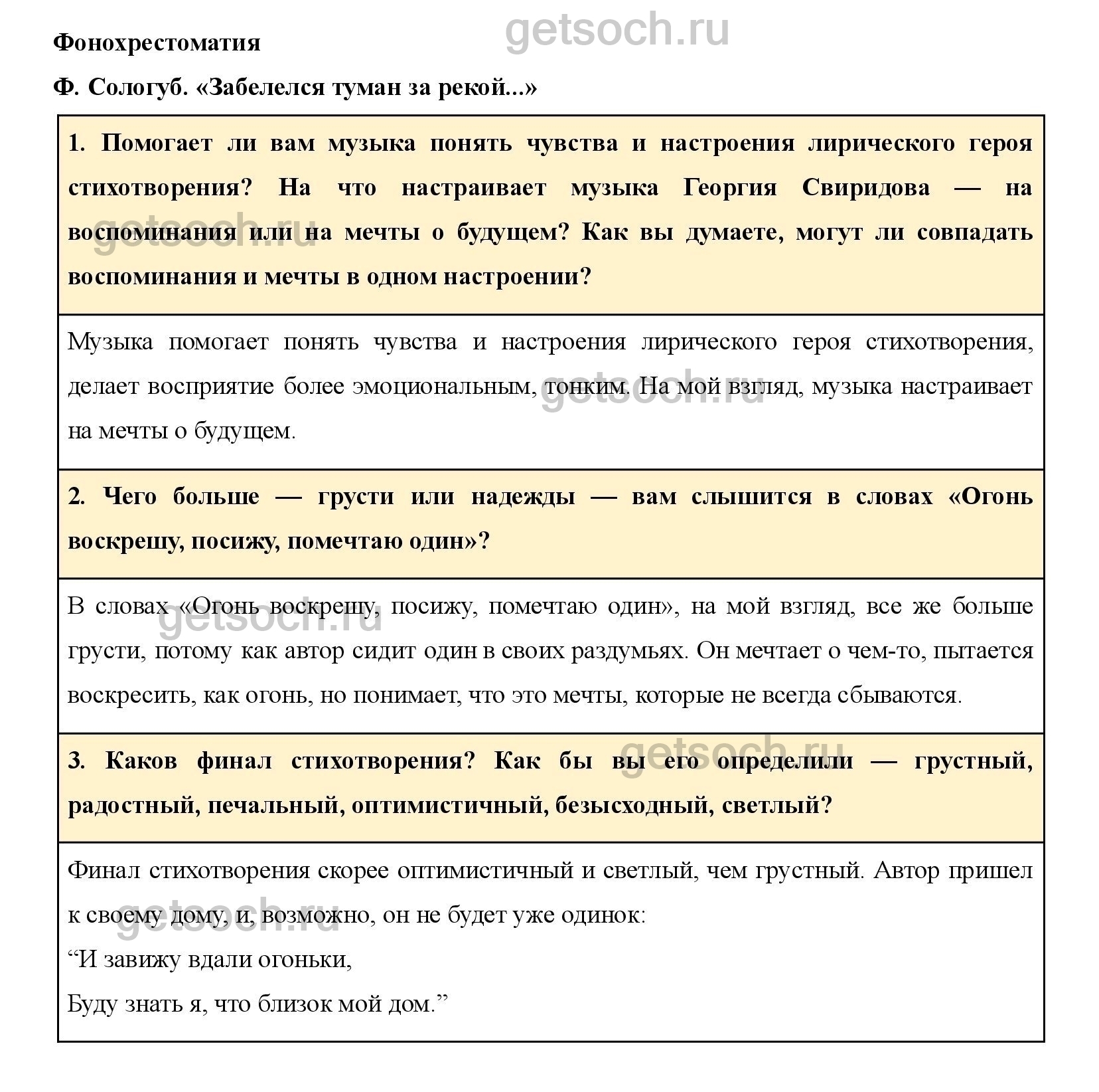 1. Помогает ли вам музыка понять чувства и настроения лирического героя стихотворения? На что настраивает музыка Георгия Свиридова — на воспоминания или на мечты о будущем? Как вы думаете, могут ли совпадать воспоминания и мечты в одном настроении?