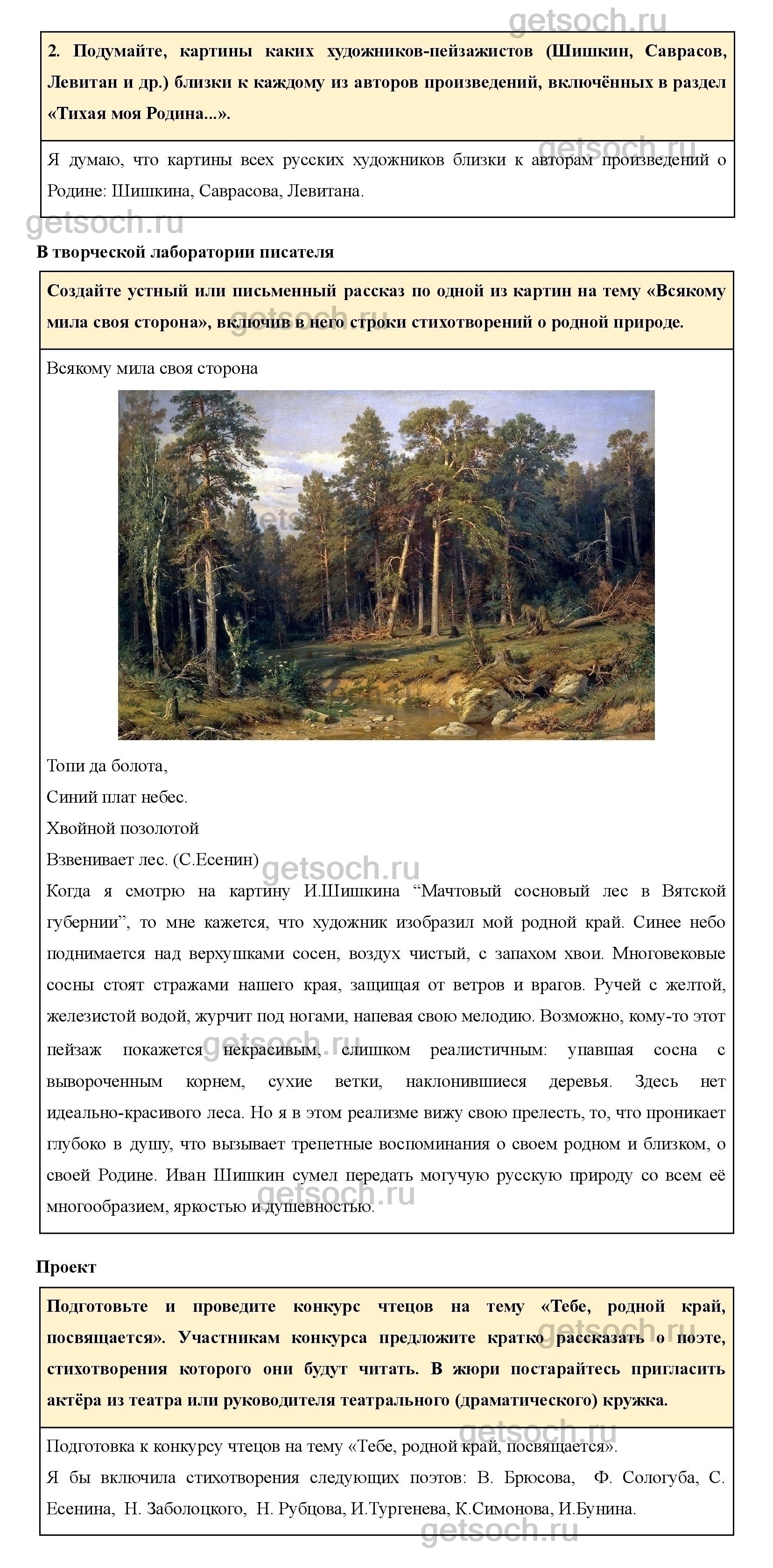 2. Подумайте, картины каких художников-пейзажистов (Шишкин, Саврасов, Левитан и др.) близки к каждому из авторов произведений, включённых в раздел «Тихая моя Родина…».