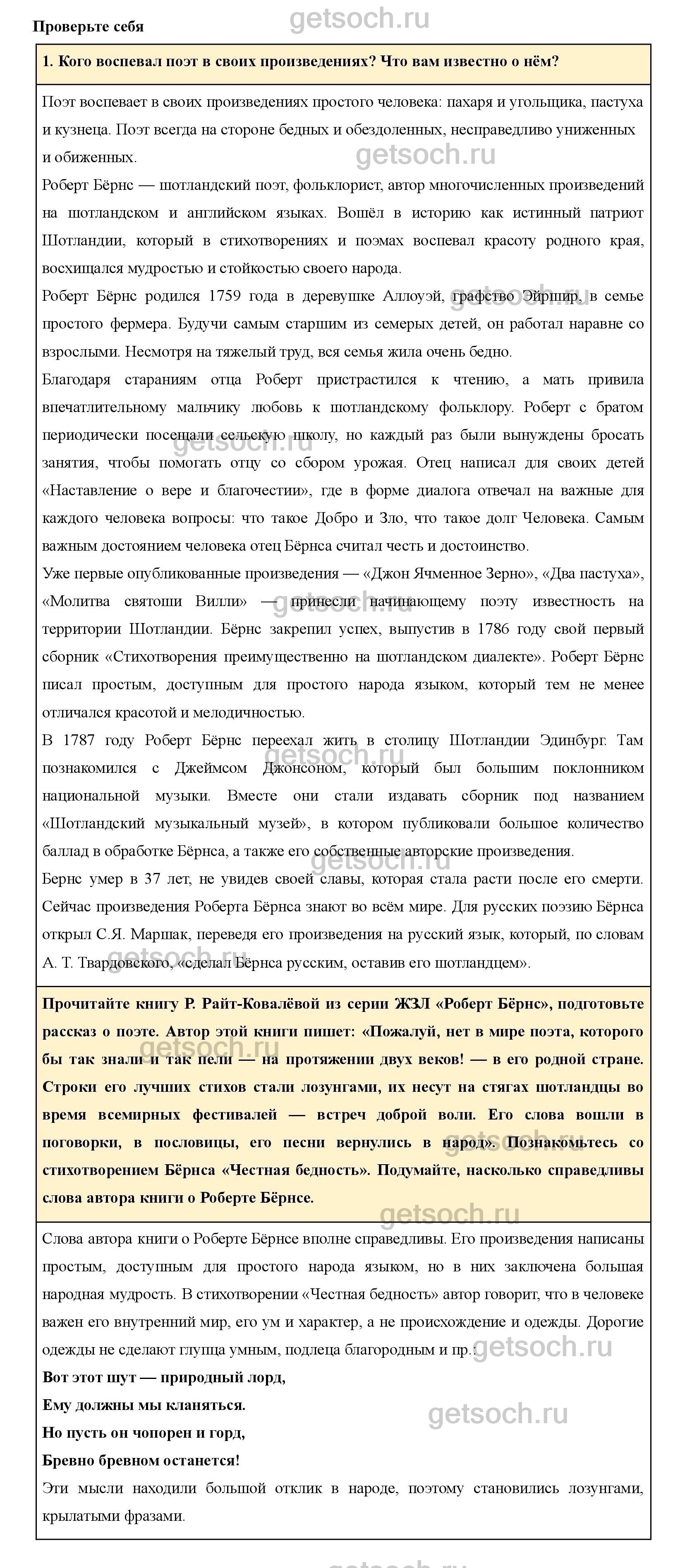 Прочитайте книгу Р. Райт-Ковалёвой из серии ЖЗЛ «Роберт Бёрнс», подготовьте рассказ о поэте. Автор этой книги пишет: «Пожалуй, нет в мире поэта, которого бы так знали и так пели — на протяжении двух веков! — в его родной стране. Строки его лучших стихов стали лозунгами, их несут на стягах шотландцы во время всемирных фестивалей — встреч доброй воли. Его слова вошли в поговорки, в пословицы, его песни вернулись в народ». Познакомьтесь со стихотворением Бёрнса «Честная бедность». Подумайте, насколько справедливы слова автора книги о Роберте Бёрнсе.