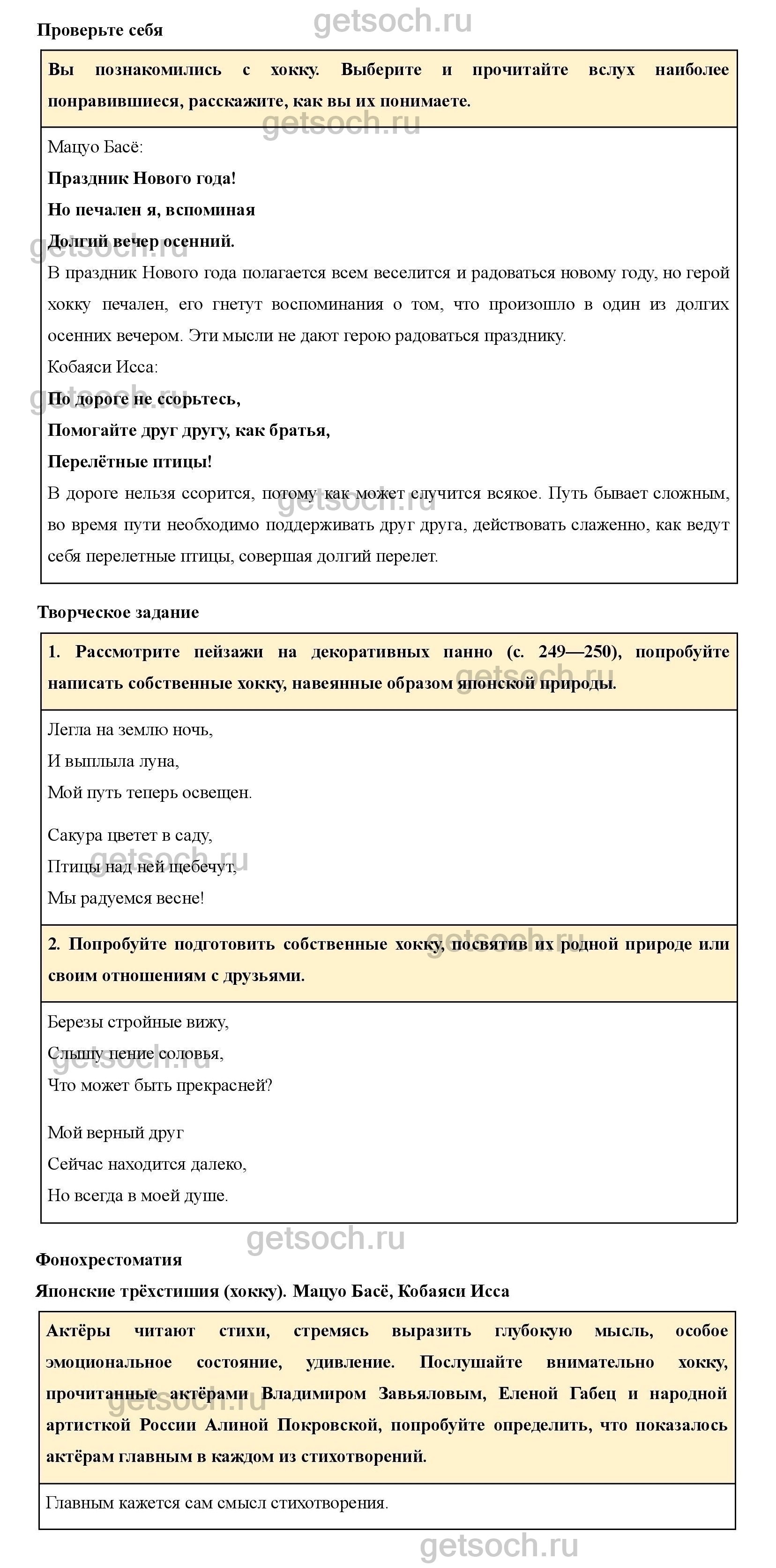 1. Рассмотрите пейзажи на декоративных панно (с. 249—250), попробуйте написать собственные хокку, навеянные образом японской природы.