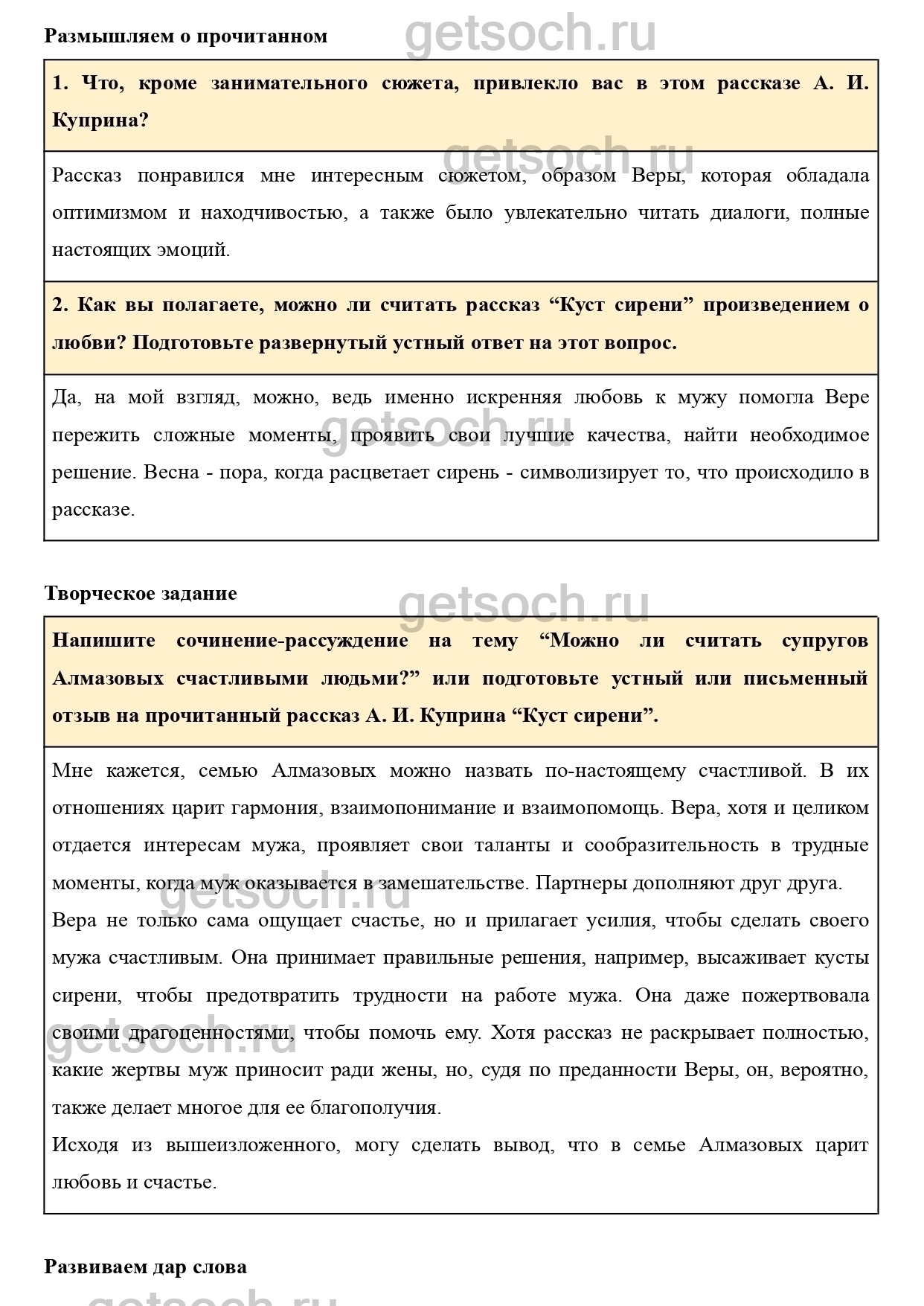 Напишите сочинение-рассуждение на тему “Можно ли считать супругов Алмазовых счастливыми людьми?” или подготовьте устный или письменный отзыв на прочитанный рассказ А. И. Куприна “Куст сирени”.