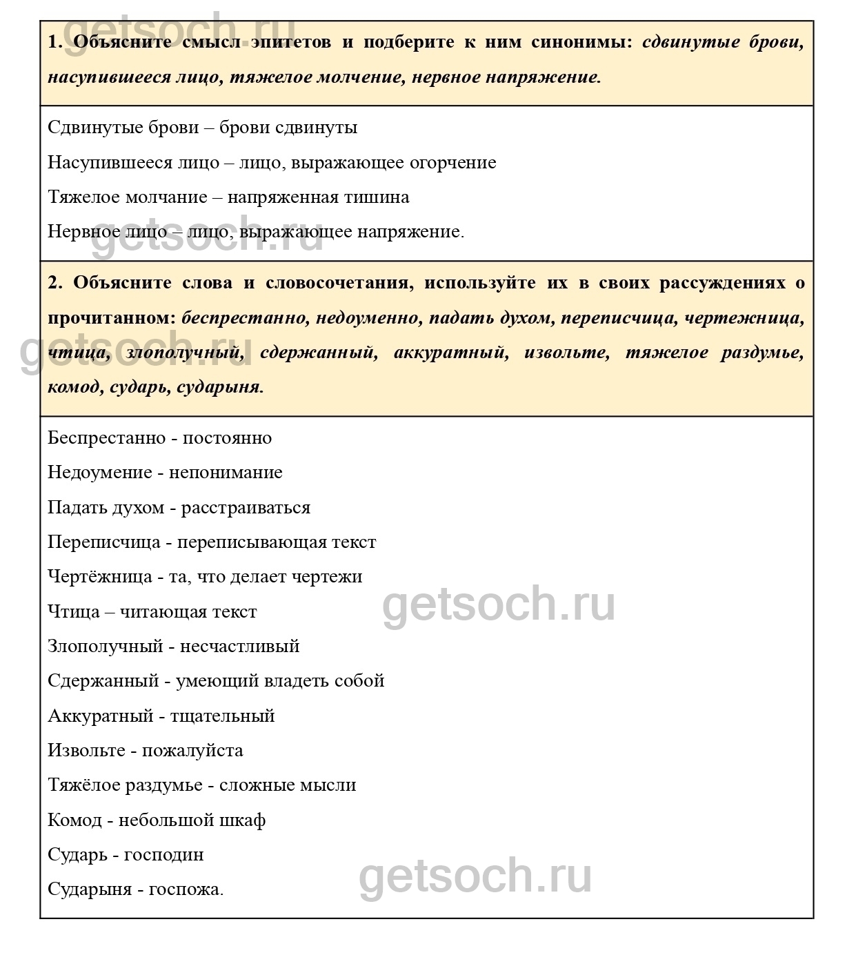 2. Объясните слова и словосочетания, используйте их в своих рассуждениях о прочитанном: беспрестанно, недоуменно, падать духом, переписчица, чертежница, чтица, злополучный, сдержанный, аккуратный, извольте, тяжелое раздумье, комод, сударь, сударыня.
