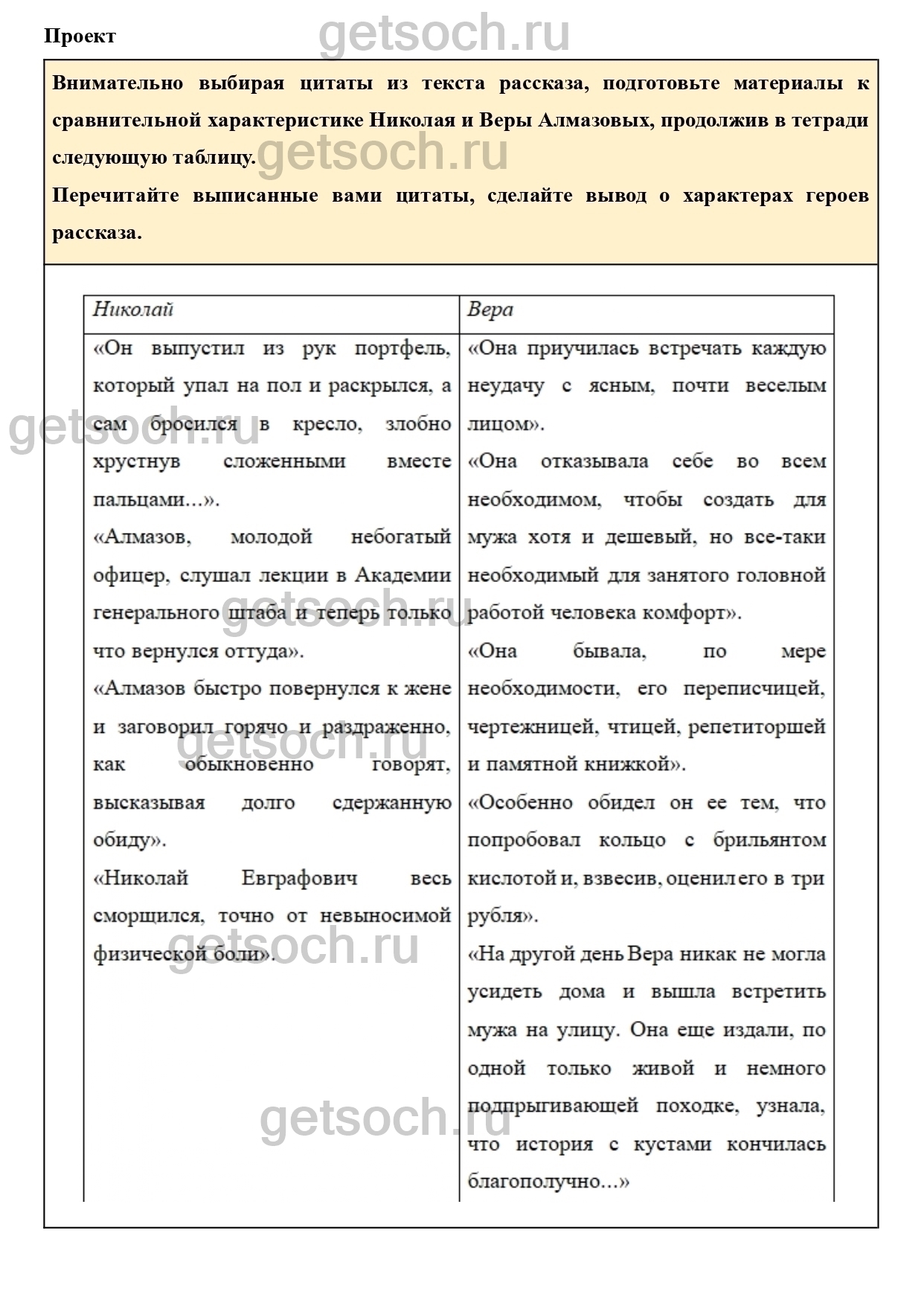 Внимательно выбирая цитаты из текста рассказа, подготовьте материалы к сравнительной характеристике Николая и Веры Алмазовых, продолжив в тетради следующую таблицу.
