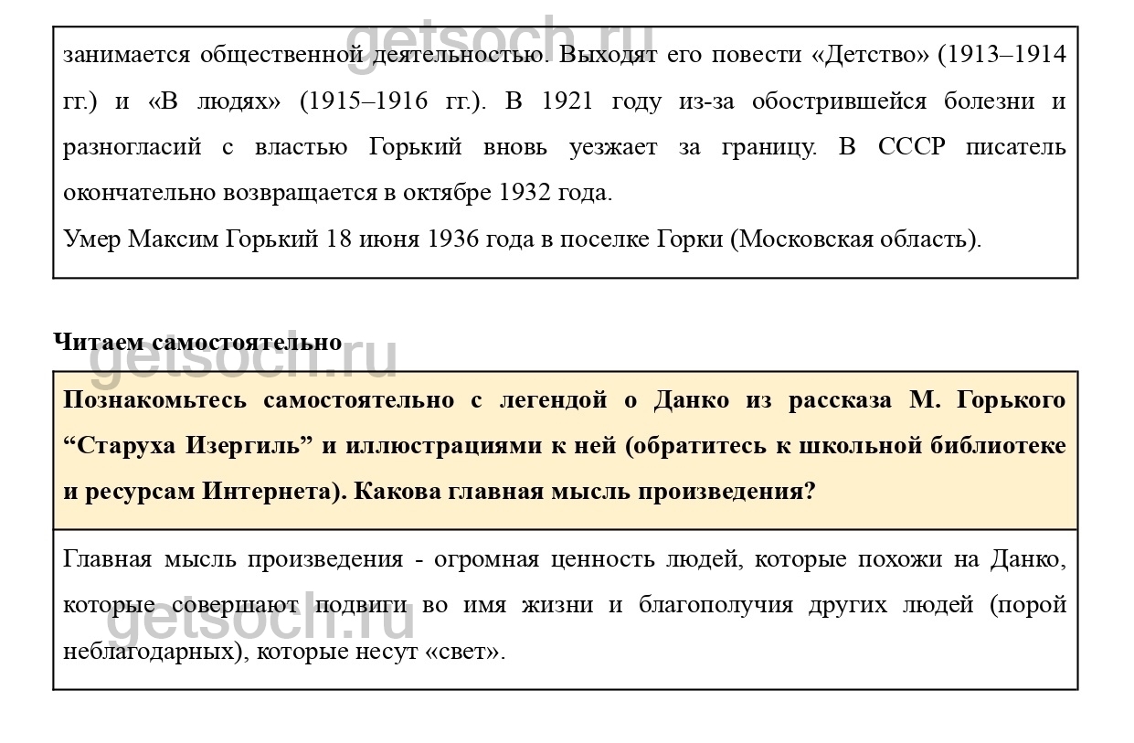 Познакомьтесь самостоятельно с легендой о Данко из рассказа М. Горького “Старуха Изергиль” и иллюстрациями к ней (обратитесь к школьной библиотеке и ресурсам Интернета). Какова главная мысль произведения?