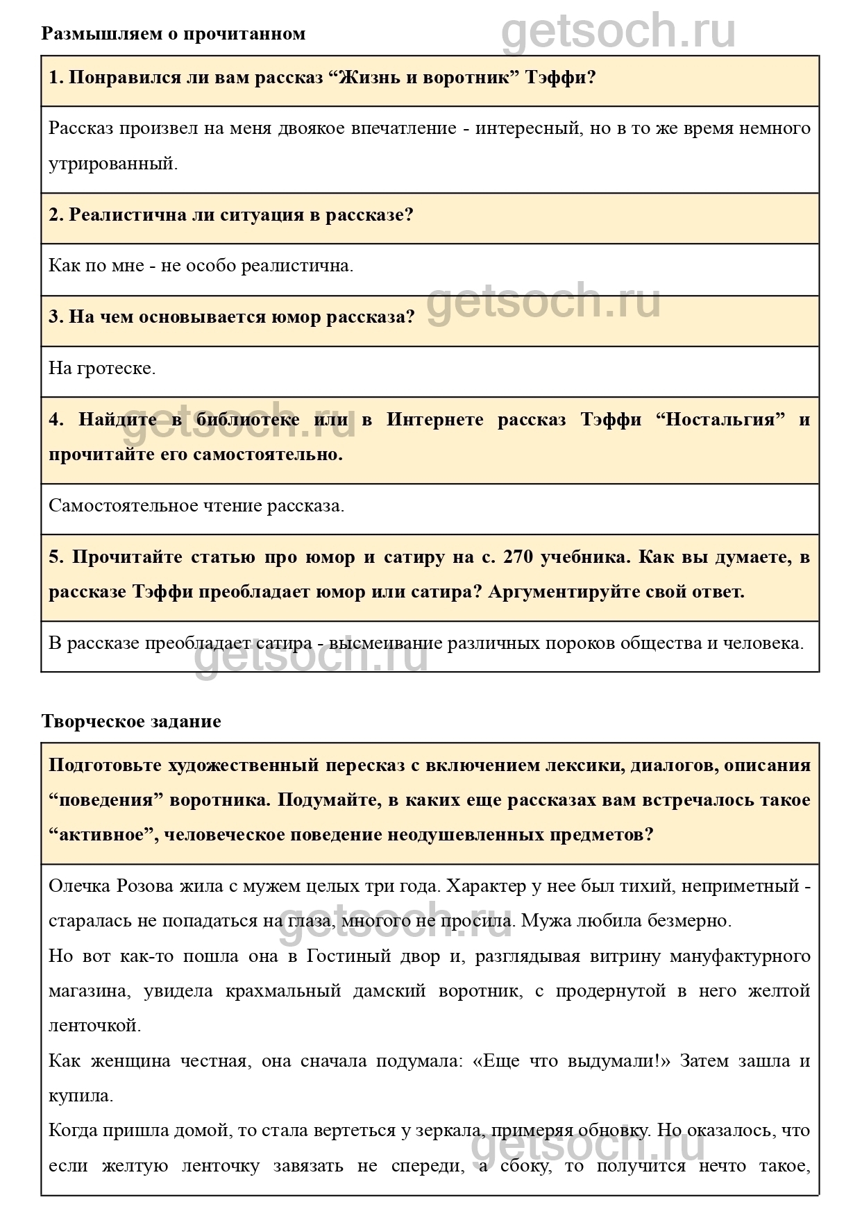 5. Прочитайте статью про юмор и сатиру на с. 270 учебника. Как вы думаете, в рассказе Тэффи преобладает юмор или сатира? Аргументируйте свой ответ.