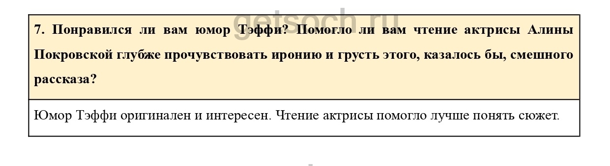 7. Понравился ли вам юмор Тэффи? Помогло ли вам чтение актрисы Алины Покровской глубже прочувствовать иронию и грусть этого, казалось бы, смешного рассказа?
