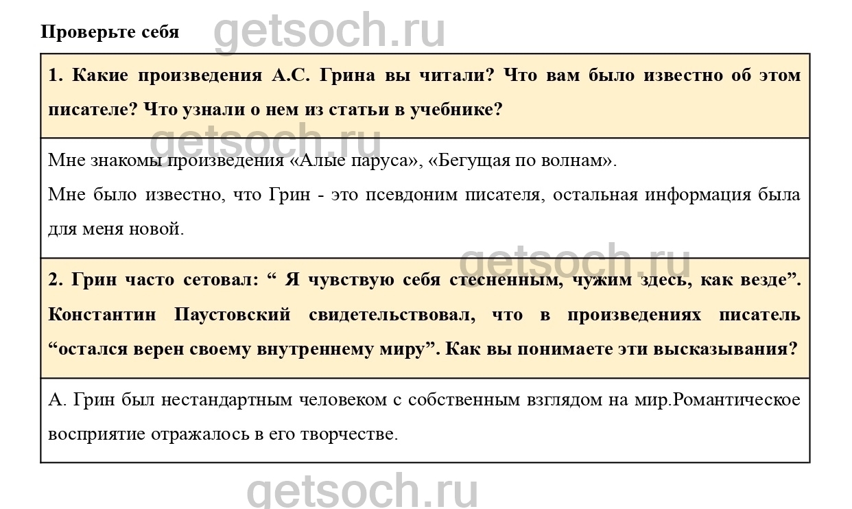 2. Грин часто сетовал: “ Я чувствую себя стесненным, чужим здесь, как везде”. Константин Паустовский свидетельствовал, что в произведениях писатель “остался верен своему внутреннему миру”. Как вы понимаете эти высказывания?