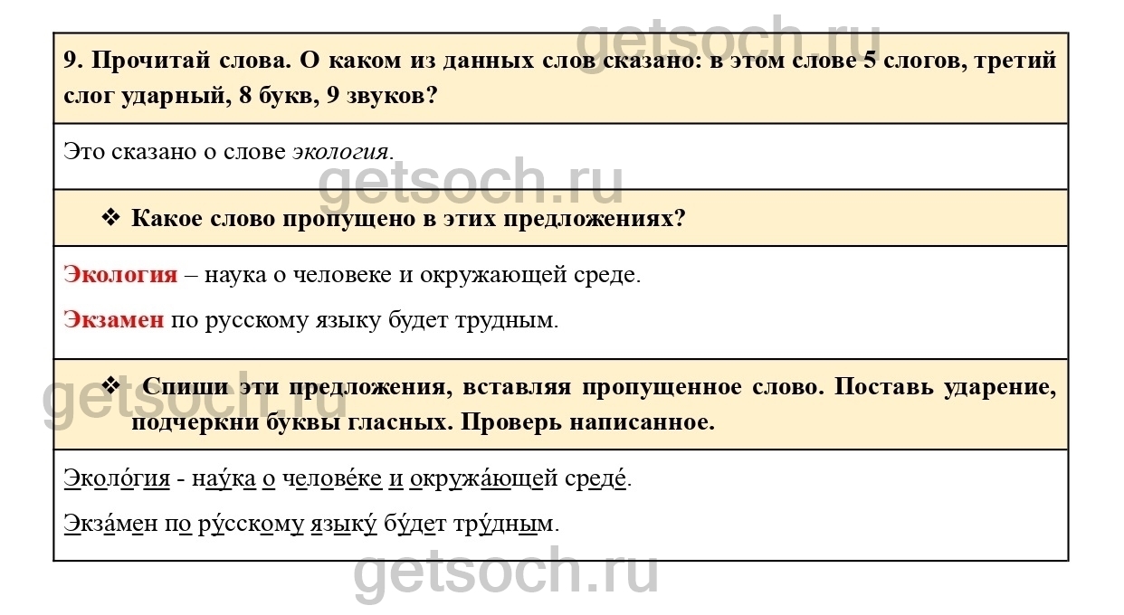 9. Прочитай слова. О каком из данных слов сказано: в этом слове 5 слогов, третий слог ударный, 8 букв, 9 звуков?
