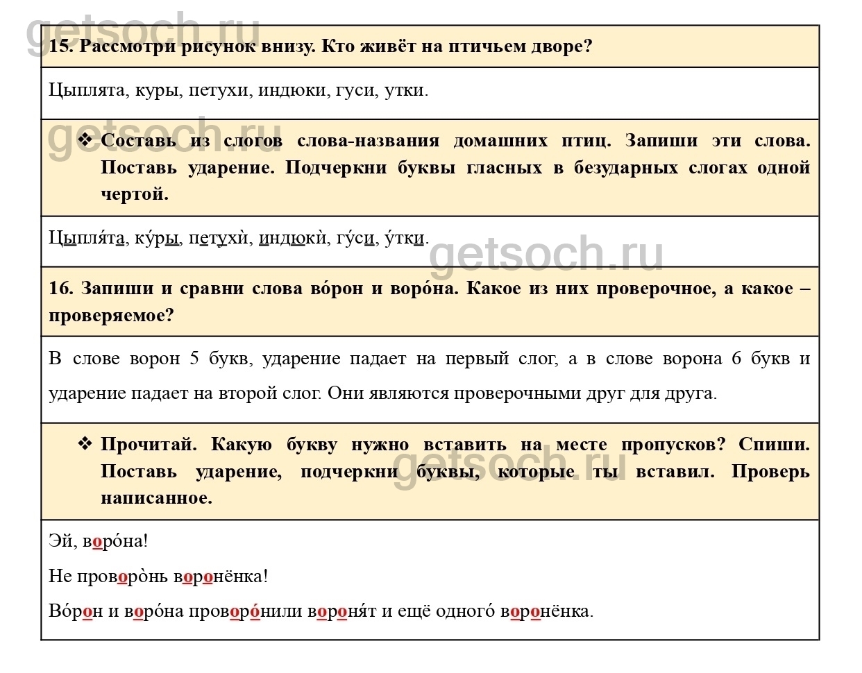 Составь из слогов слова-названия домашних птиц. Запиши эти слова. Поставь ударение. Подчеркни буквы гласных в безударных слогах одной чертой.