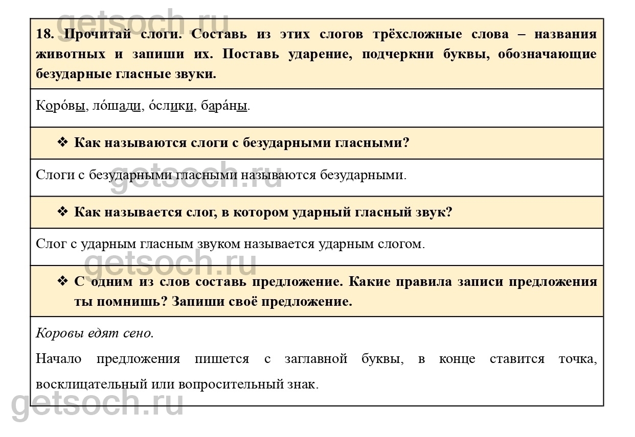 18. Прочитай слоги. Составь из этих слогов трёхсложные слова – названия животных и запиши их. Поставь ударение, подчеркни буквы, обозначающие безударные гласные звуки.