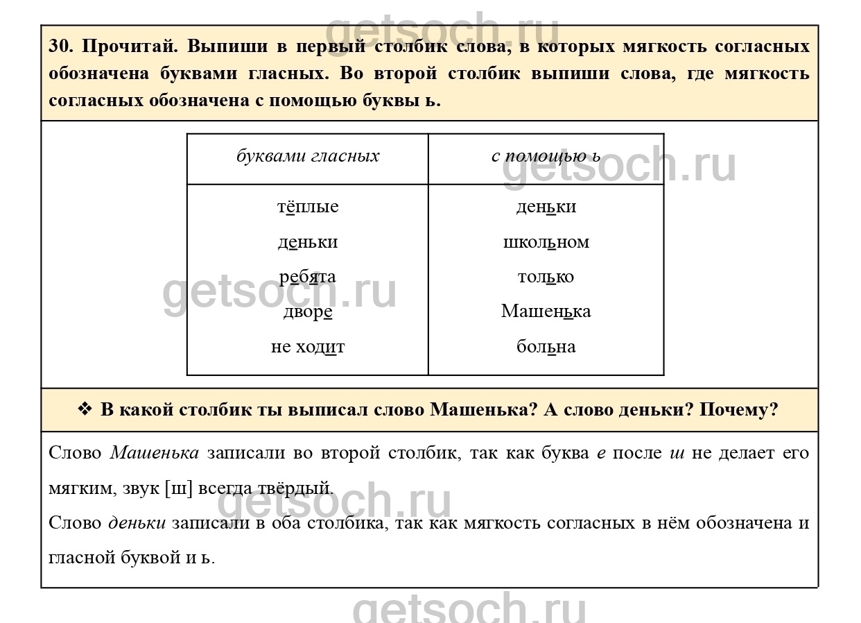 30. Прочитай. Выпиши в первый столбик слова, в которых мягкость согласных обозначена буквами гласных. Во второй столбик выпиши слова, где мягкость согласных обозначена с помощью буквы ь.