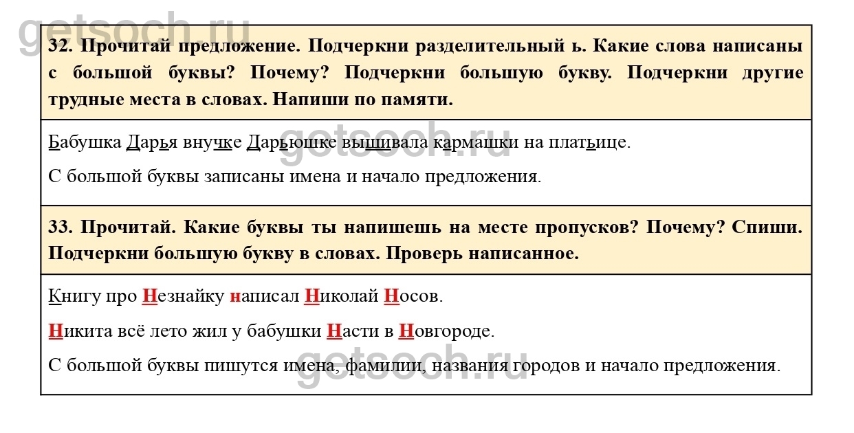 32. Прочитай предложение. Подчеркни разделительный ь. Какие слова написаны с большой буквы? Почему? Подчеркни большую букву. Подчеркни другие трудные места в словах. Напиши по памяти.