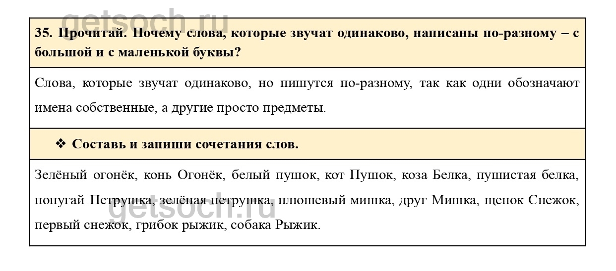 35. Прочитай. Почему слова, которые звучат одинаково, написаны по-разному – с большой и с маленькой буквы?