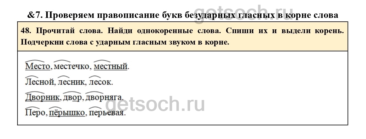 48. Прочитай слова. Найди однокоренные слова. Спиши их и выдели корень. Подчеркни слова с ударным гласным звуком в корне