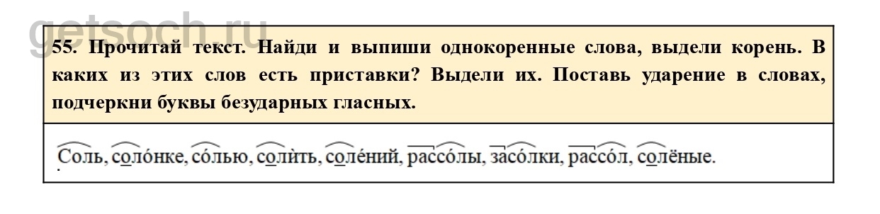 55. Прочитай текст. Найди и выпиши однокоренные слова, выдели корень. В каких из этих слов есть приставки? Выдели их. Поставь ударение в словах, подчеркни буквы безударных гласных.