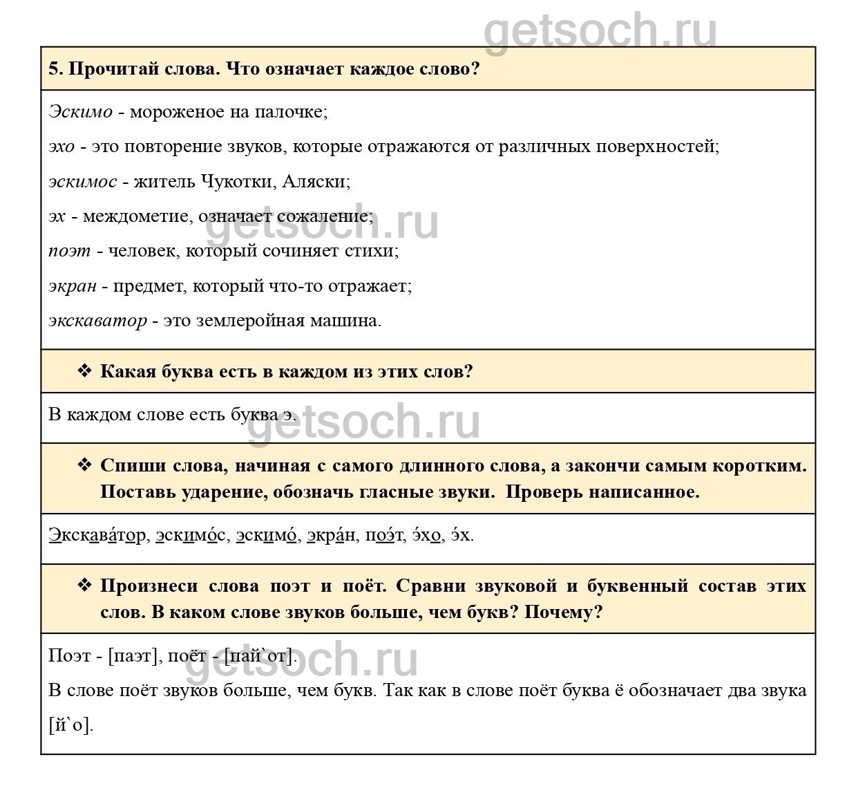 Произнеси слова поэт и поёт. Сравни звуковой и буквенный состав этих слов. В каком слове звуков больше, чем букв? Почему?
