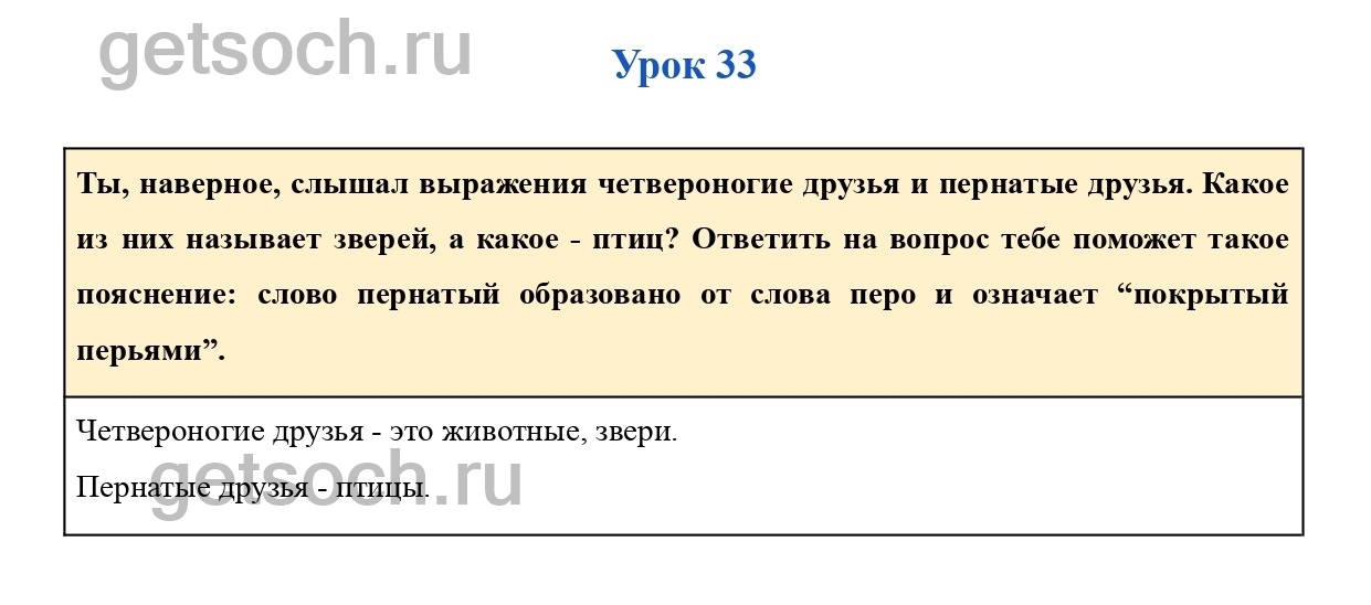 Ты, наверное, слышал выражения четвероногие друзья и пернатые друзья. Какое из них называет зверей, а какое – птиц? Ответить на вопрос тебе поможет такое пояснение: слово пернатый образовано от слова перо и означает “покрытый перьями”.