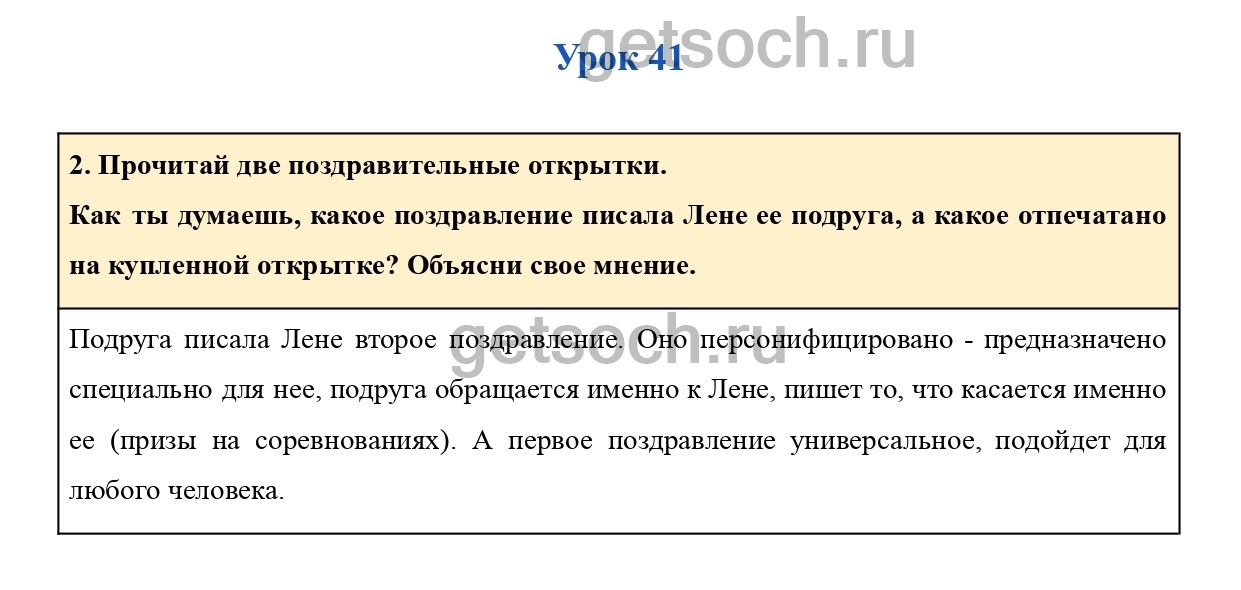 Как ты думаешь, какое поздравление писала Лене ее подруга, а какое отпечатано на купленной открытке? Объясни свое мнение.
