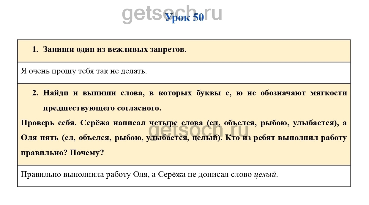 Проверь себя. Серёжа написал четыре слова (ел, объелся, рыбою, улыбается), а Оля пять (ел, объелся, рыбою, улыбается, целый). Кто из ребят выполнил работу правильно? Почему?”