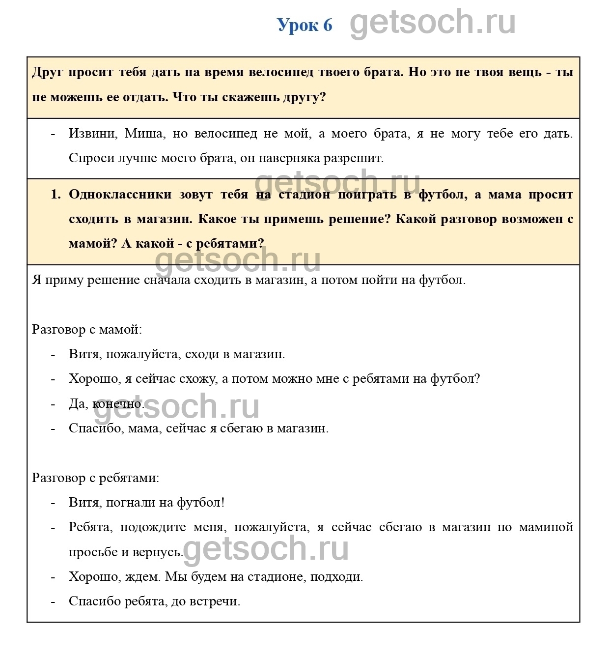 Одноклассники зовут тебя на стадион поиграть в футбол, а мама просит сходить в магазин. Какое ты примешь решение? Какой разговор возможен с мамой? А какой – с ребятами?