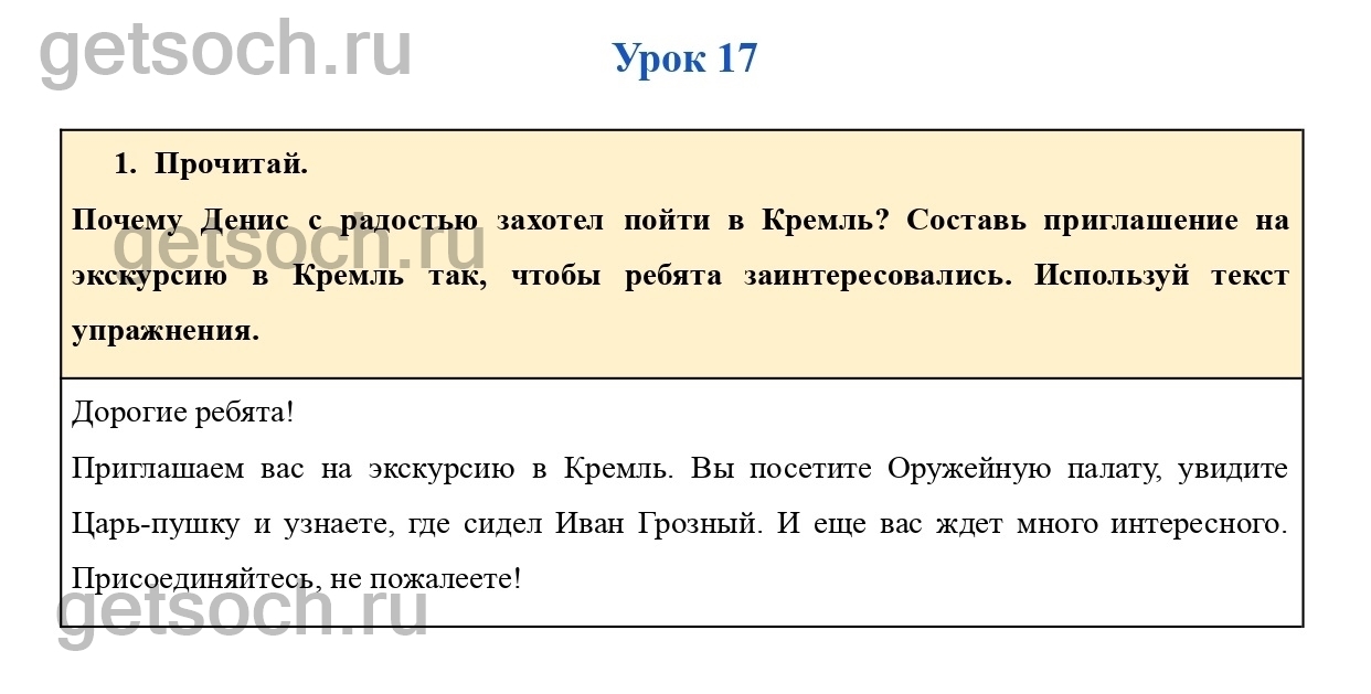 Почему Денис с радостью захотел пойти в Кремль? Составь приглашение на экскурсию в Кремль так, чтобы ребята заинтересовались. Используй текст упражнения.”