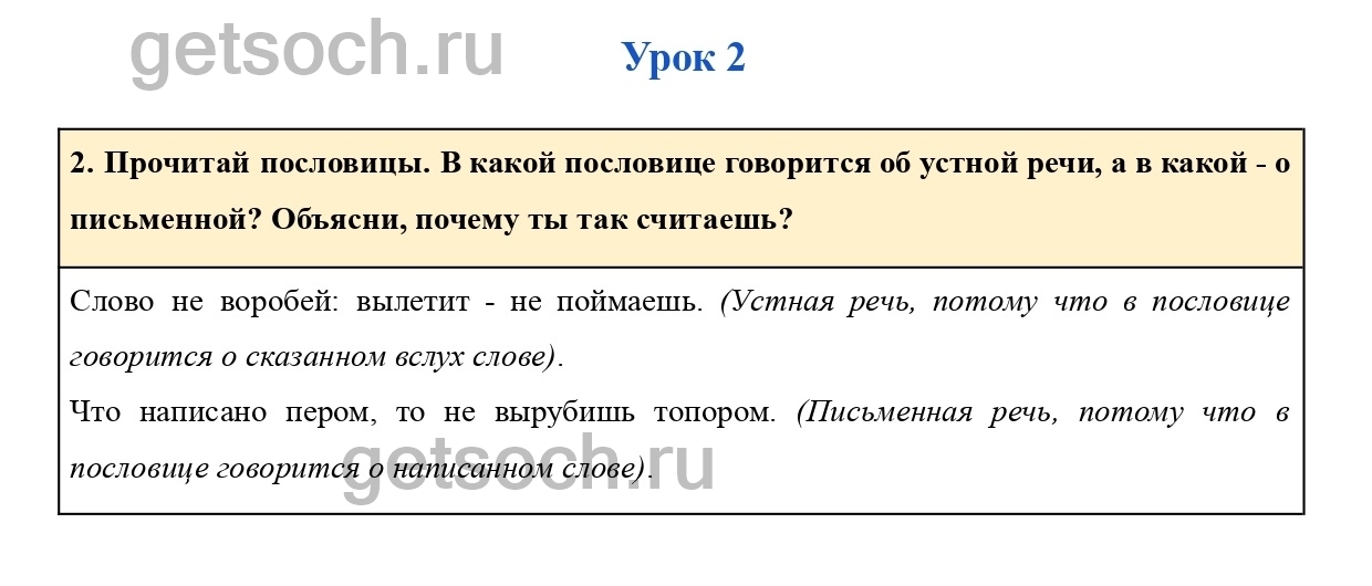 2. Прочитай пословицы. В какой пословице говорится об устной речи, а в какой – о письменной? Объясни, почему ты так считаешь?