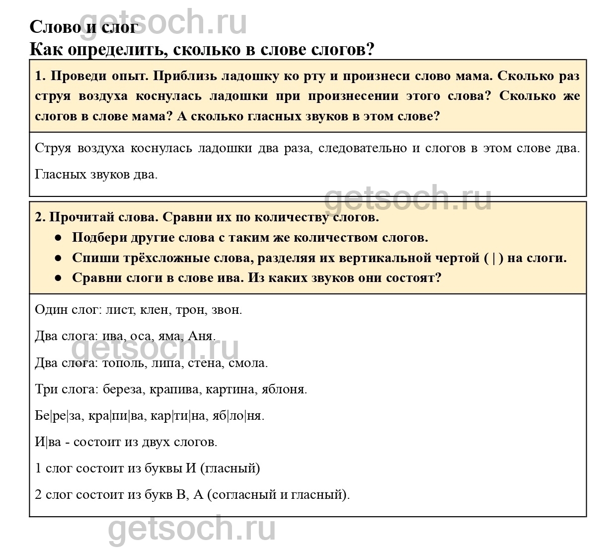 1. Проведи опыт. Приблизь ладошку ко рту и произнеси слово мама. Сколько раз струя воздуха коснулась ладошки при произнесении этого слова? Сколько же слогов в слове мама? А сколько гласных звуков в этом слове?