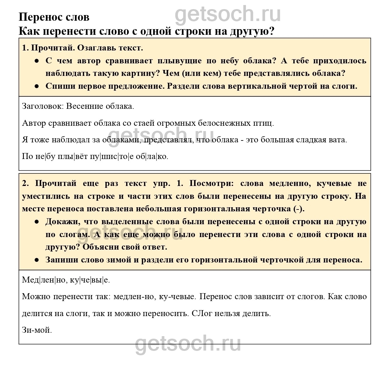 2. Прочитай еще раз текст упр. 1. Посмотри: слова медленно, кучевые не уместились на строке и части этих слов были перенесены на другую строку. На месте переноса поставлена небольшая горизонтальная черточка (-). Докажи, что выделенные слова были перенесены с одной строки на другую по слогам. А как еще можно было перенести эти слова с одной строки на другую? Объясни свой ответ.