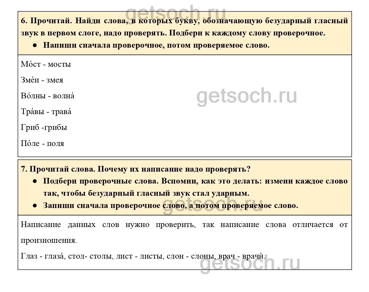 6. Прочитай. Найди слова, в которых букву, обозначающую безударный гласный звук в первом слоге, надо проверять. Подбери к каждому слову проверочное.