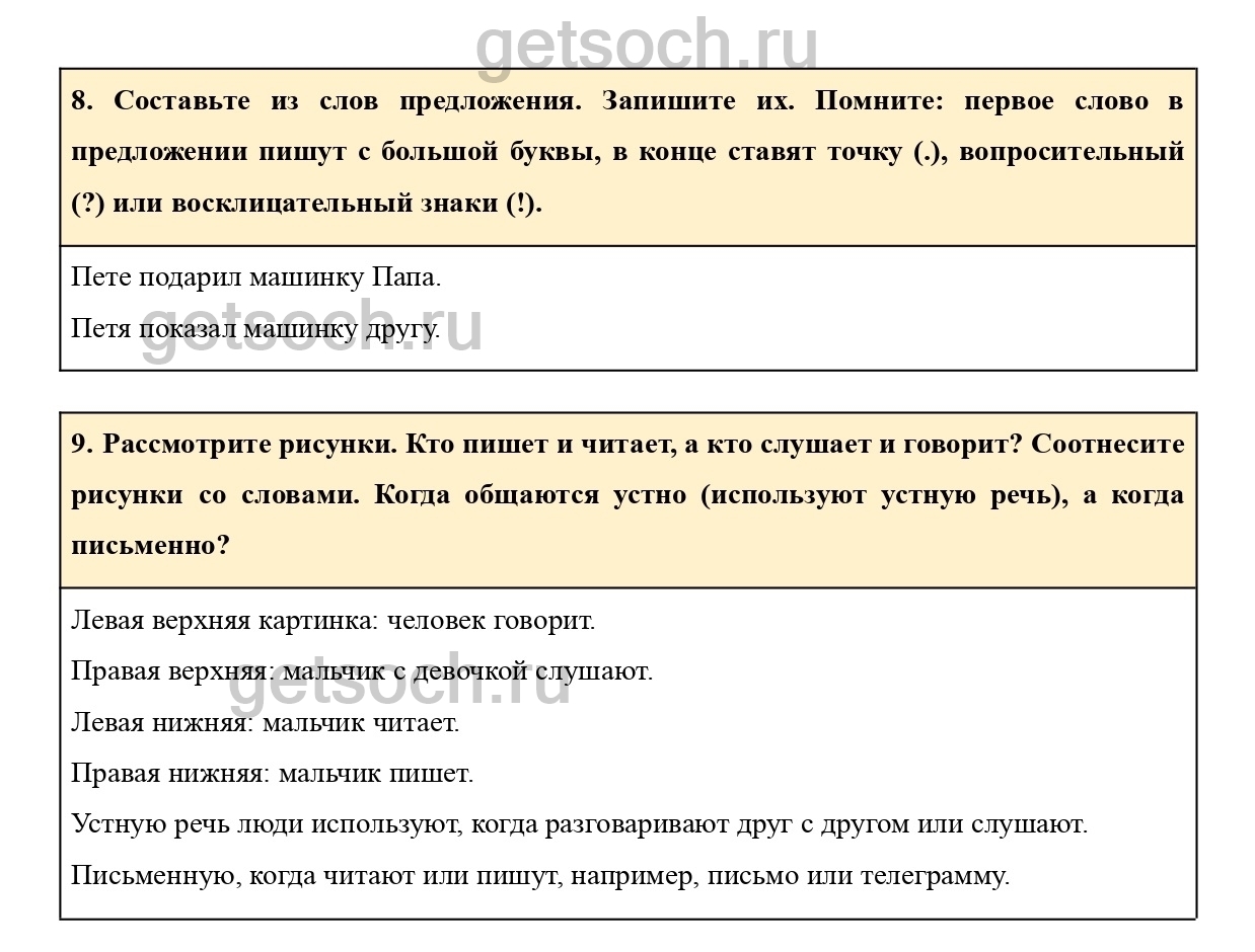 9. Рассмотрите рисунки. Кто пишет и читает, а кто слушает и говорит? Соотнесите рисунки со словами. Когда общаются устно (используют устную речь), а когда письменно?