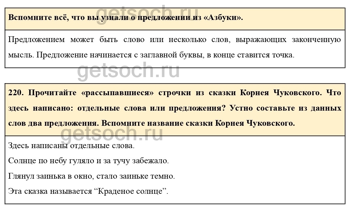 220. Прочитайте «рассыпавшиеся» строчки из сказки Корнея Чуковского. Что здесь написано: отдельные слова или предложения? Устно составьте из данных слов два предложения. Вспомните название сказки Корнея Чуковского.