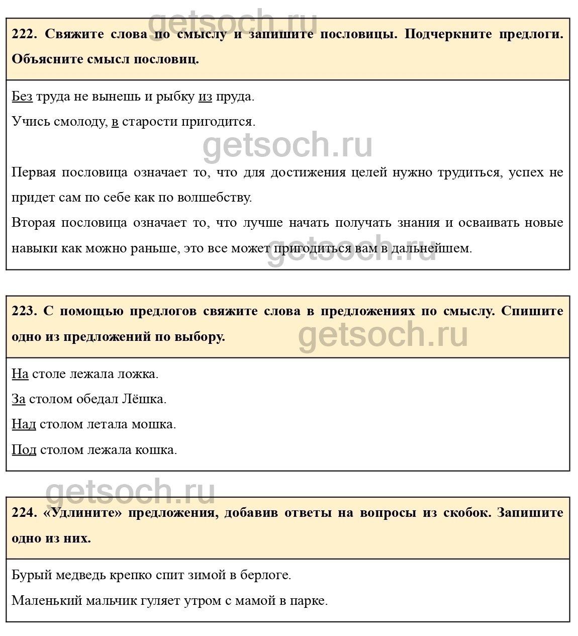 222. Свяжите слова по смыслу и запишите пословицы. Подчеркните предлоги. Объясните смысл пословиц.