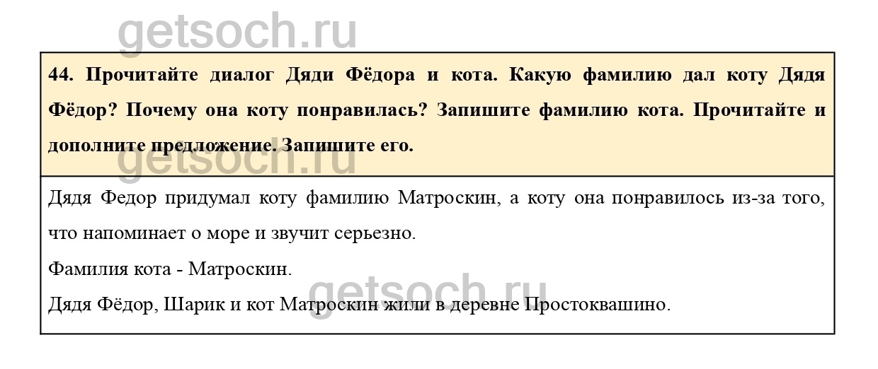 44. Прочитайте диалог Дяди Фёдора и кота. Какую фамилию дал коту Дядя Фёдор? Почему она коту понравилась? Запишите фамилию кота. Прочитайте и дополните предложение. Запишите его.