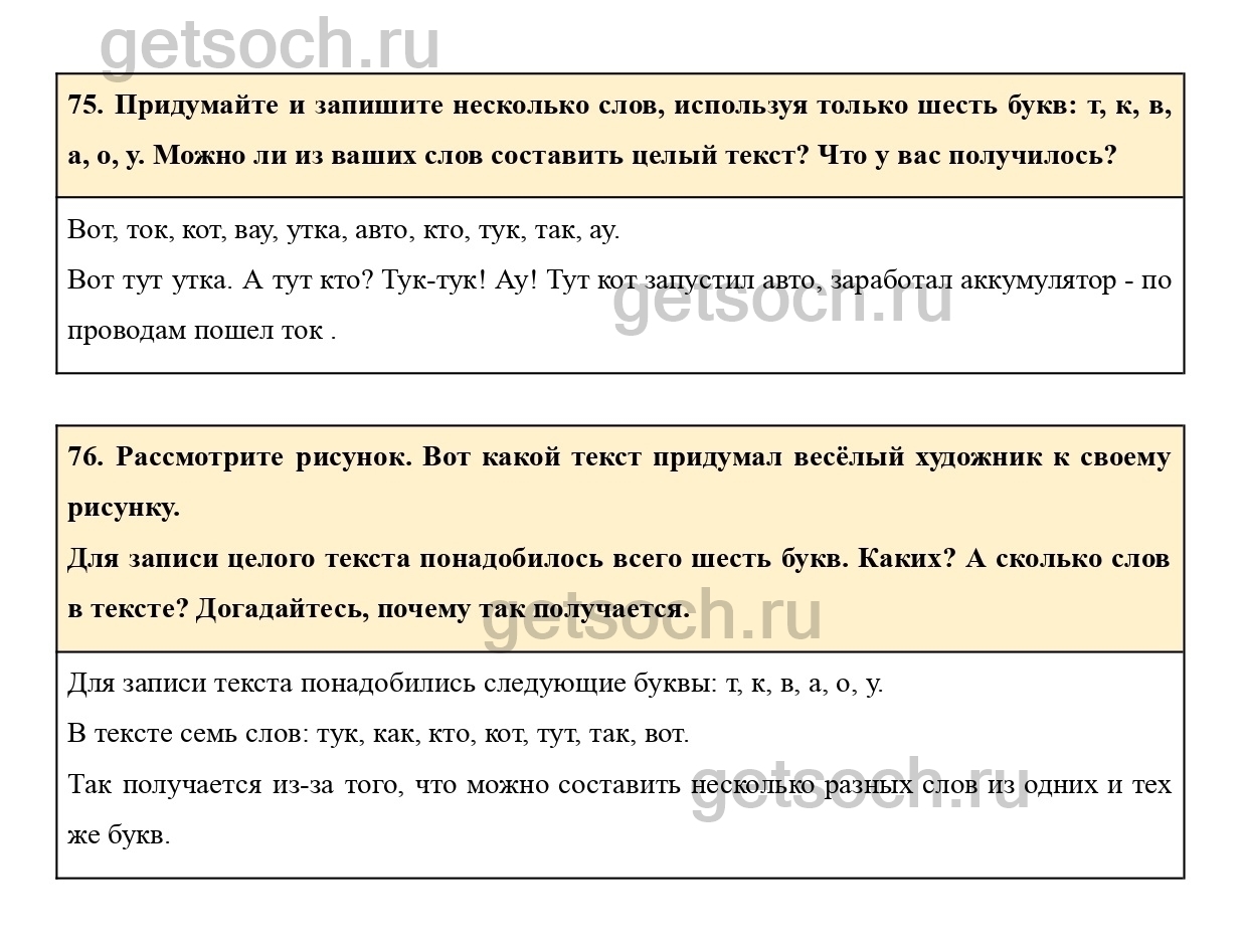 75. Придумайте и запишите несколько слов, используя только шесть букв: т, к, в, а, о, у. Можно ли из ваших слов составить целый текст? Что у вас получилось?