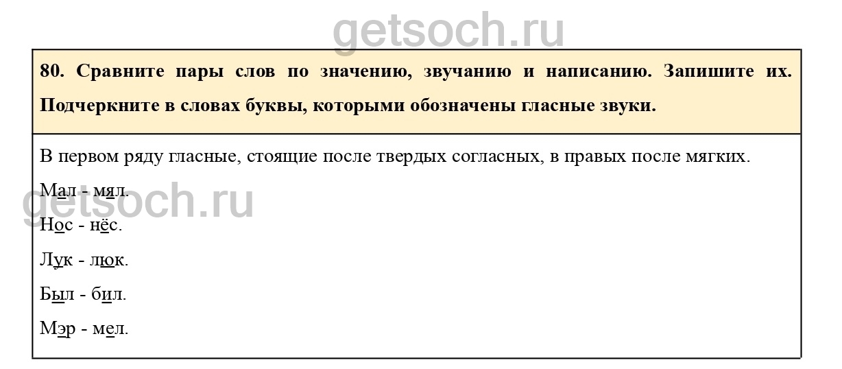 80. Сравните пары слов по значению, звучанию и написанию. Запишите их. Подчеркните в словах буквы, которыми обозначены гласные звуки.