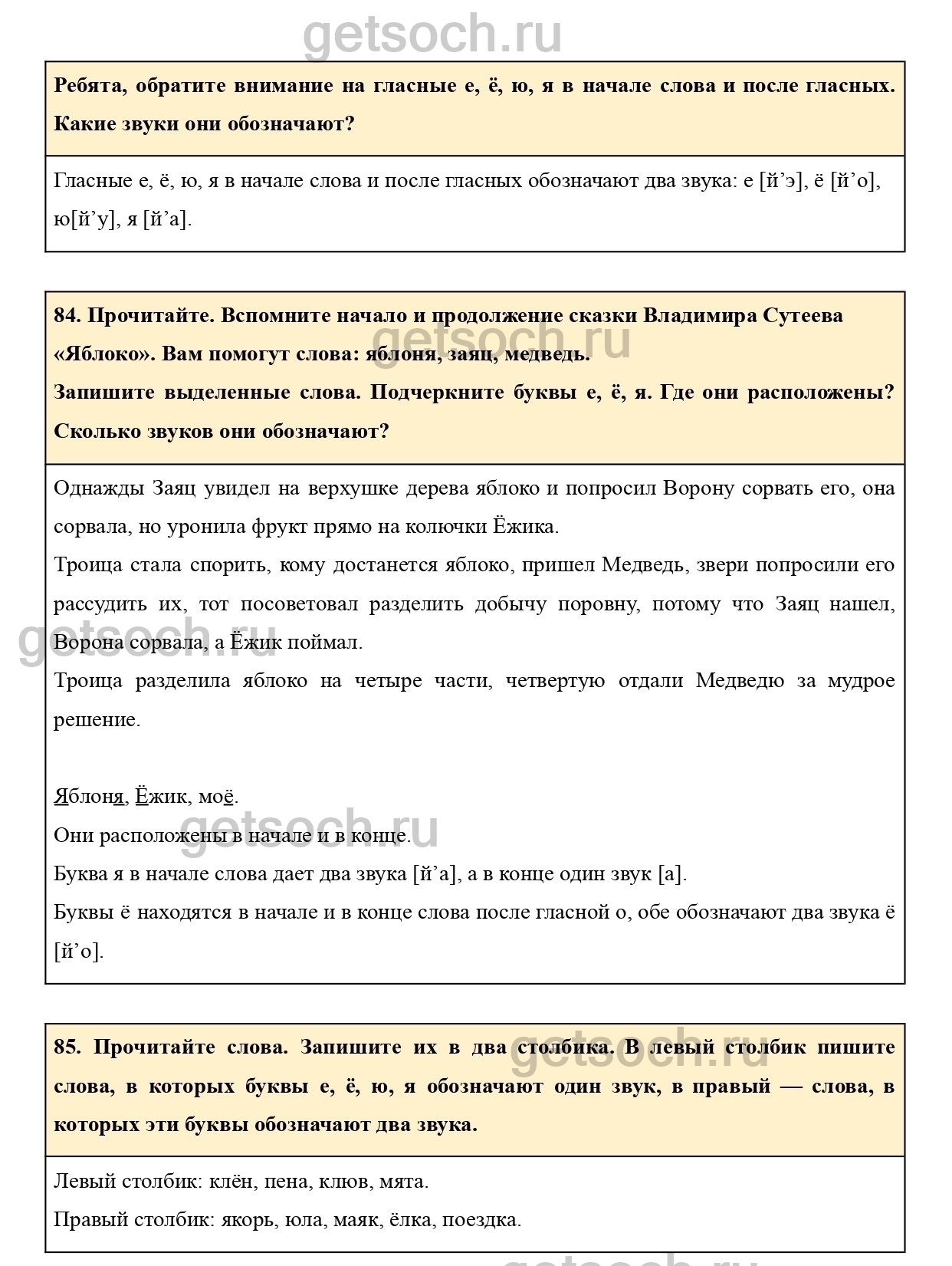 85. Прочитайте слова. Запишите их в два столбика. В левый столбик пишите слова, в которых буквы е, ё, ю, я обозначают один звук, в правый — слова, в которых эти буквы обозначают два звука.