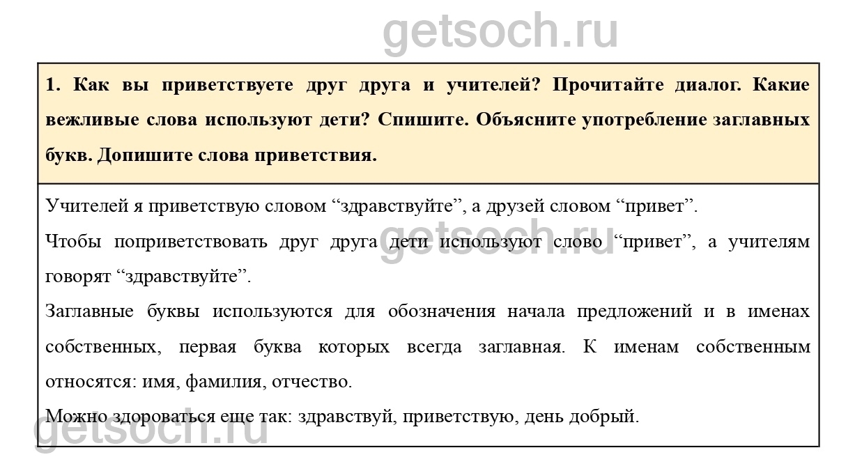 1. Как вы приветствуете друг друга и учителей? Прочитайте диалог. Какие вежливые слова используют дети? Спишите. Объясните употребление заглавных букв. Допишите слова приветствия.