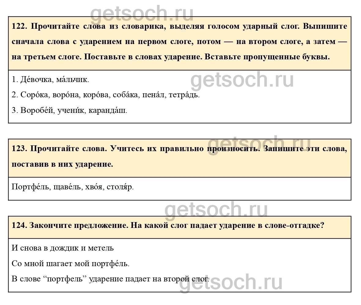 122. Прочитайте слова из словарика, выделяя голосом ударный слог. Выпишите сначала слова с ударением на первом слоге, потом — на втором слоге, а затем — на третьем слоге. Поставьте в словах ударение. Вставьте пропущенные буквы.