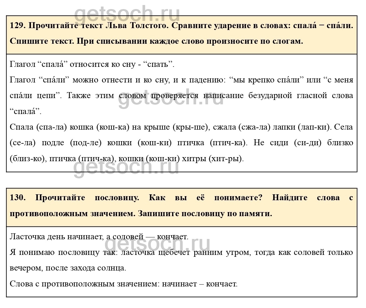 129. Прочитайте текст Льва Толстого. Сравните ударение в словах: спала́ − спа́ли. Спишите текст. При списывании каждое слово произносите по слогам.
