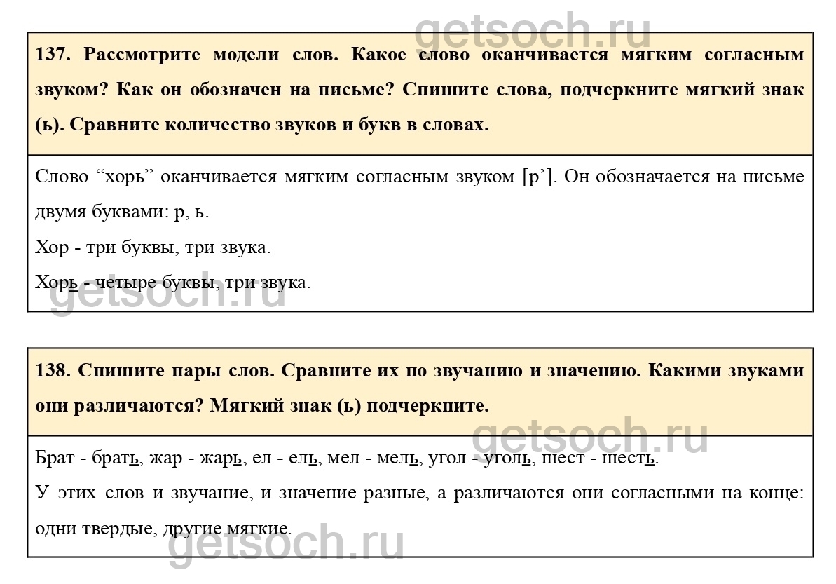 138. Спишите пары слов. Сравните их по звучанию и значению. Какими звуками они различаются? Мягкий знак (ь) подчеркните.
