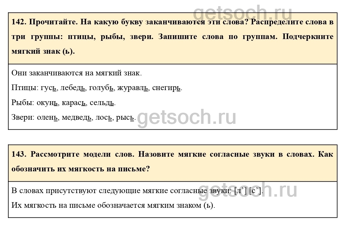 142. Прочитайте. На какую букву заканчиваются эти слова? Распределите слова в три группы: птицы, рыбы, звери. Запишите слова по группам. Подчеркните мягкий знак (ь).