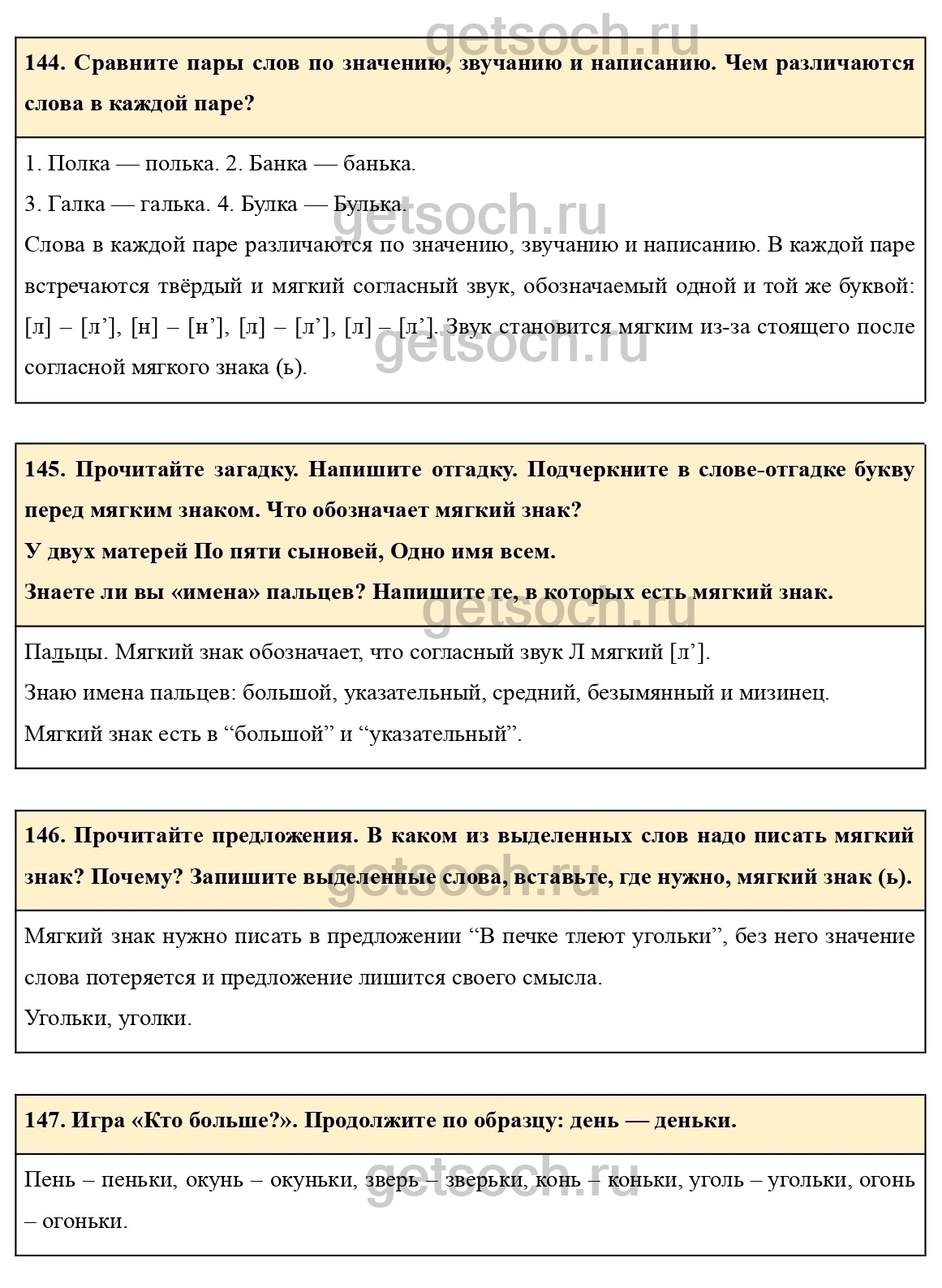 145. Прочитайте загадку. Напишите отгадку. Подчеркните в слове-отгадке букву перед мягким знаком. Что обозначает мягкий знак?