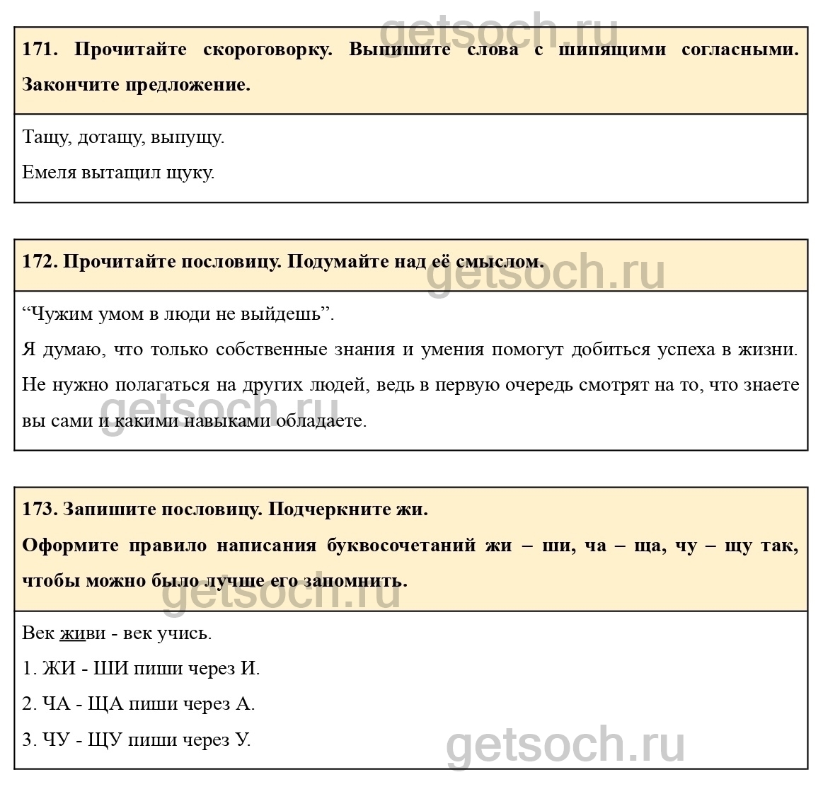 171. Прочитайте скороговорку. Выпишите слова с шипящими согласными. Закончите предложение.